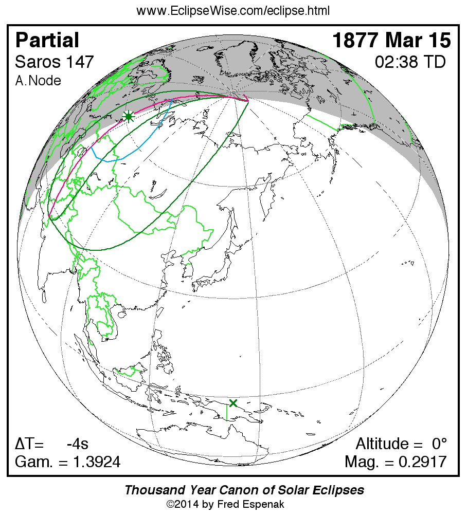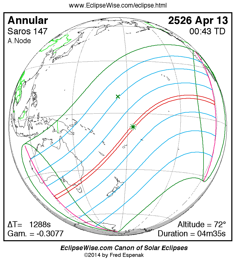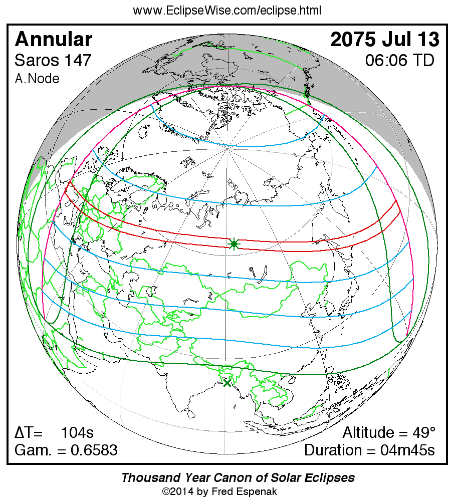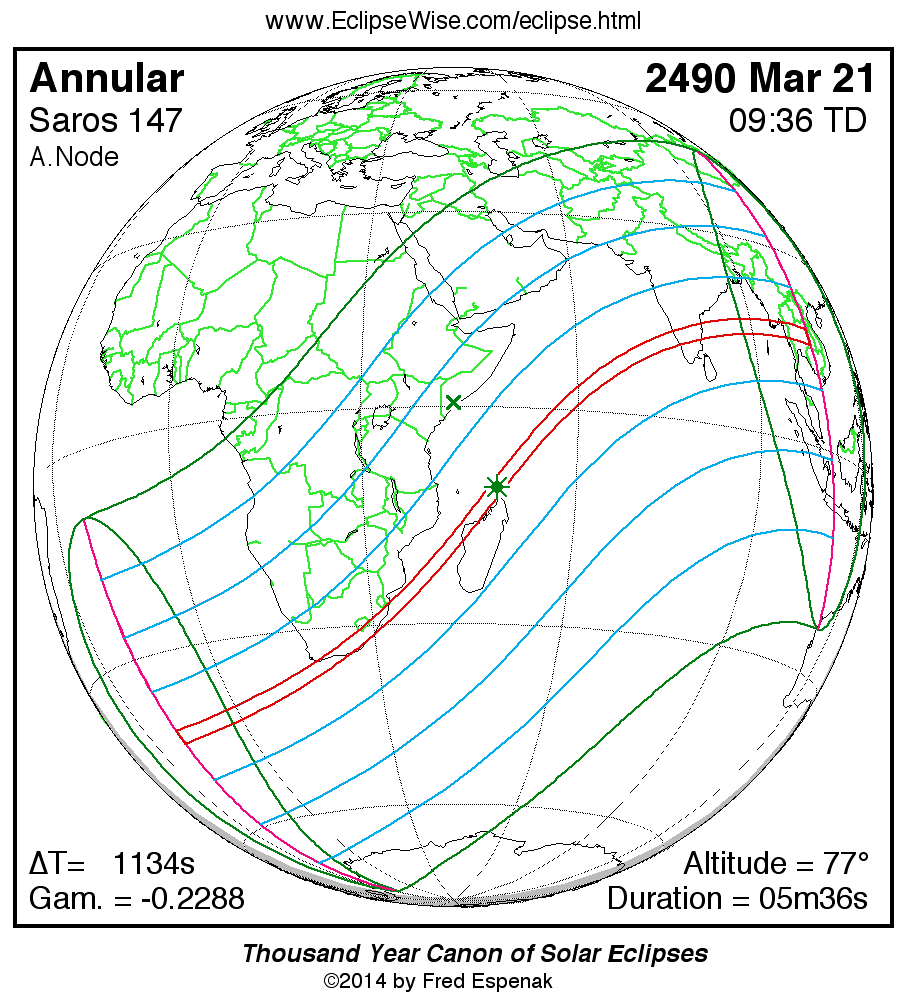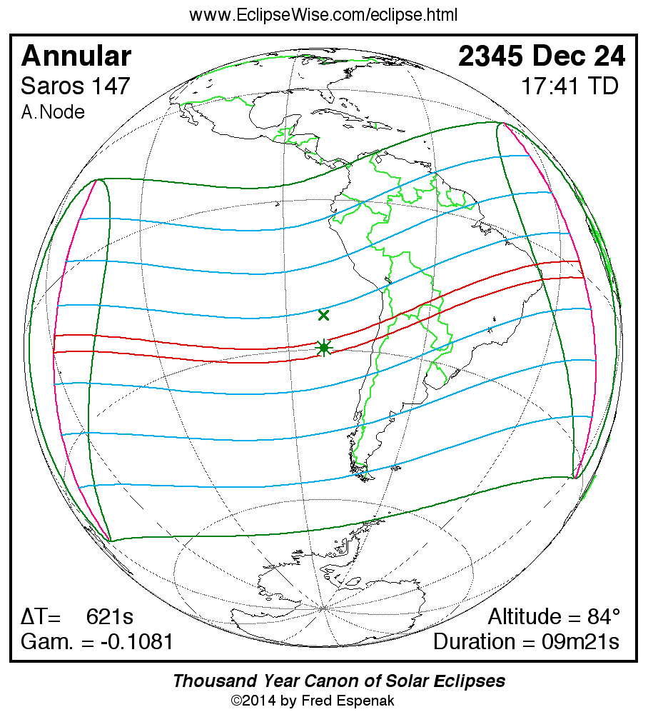 A panorama of all solar eclipses belonging to Saros 147 is presented here. Each map depicts the geographic region of visibility for a single eclipse. For central eclipses, the total or annular path is plotted in either blue (total) or red (annular). The date and time is given for the instant of Greatest Eclipse. Every map serves as a hyperlink to the EclipseWise Prime page for that eclipse where a larger map and complete details for the eclipse can be found. Visit the Key to Solar Eclipse Maps for a detailed explanation of these maps. Near the bottom of the page are a series of hyperlinks for more on solar eclipses.