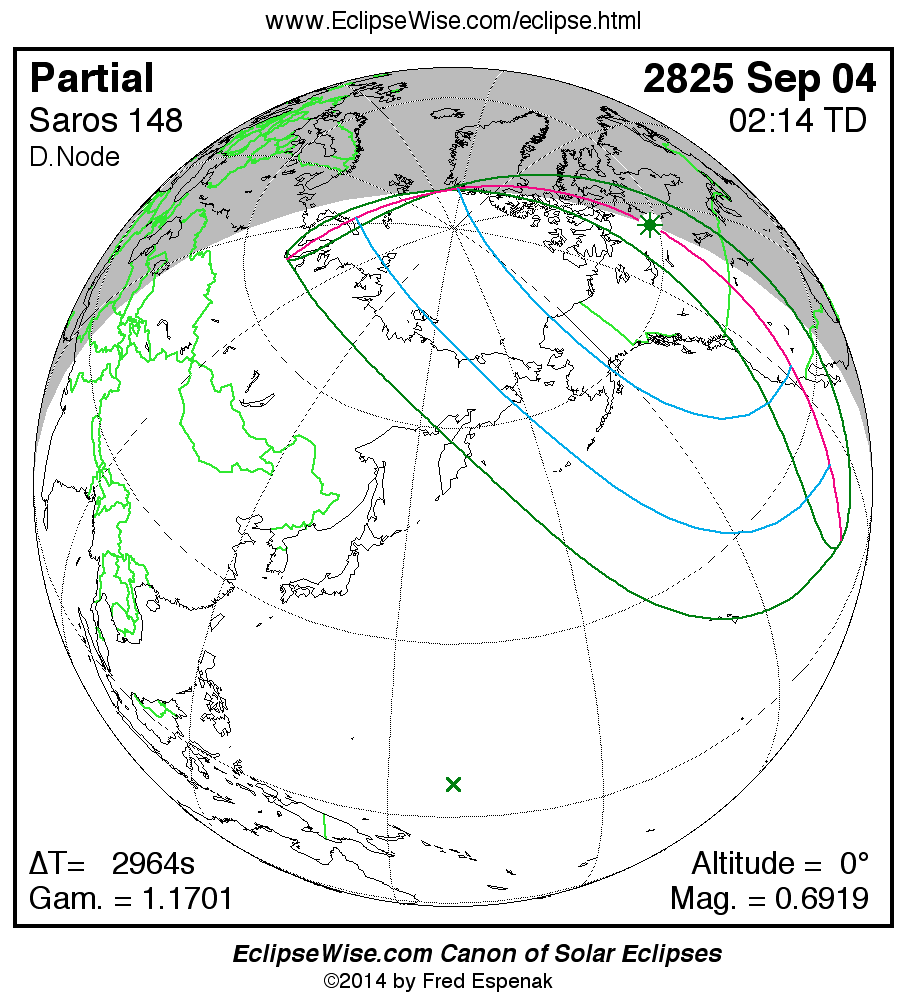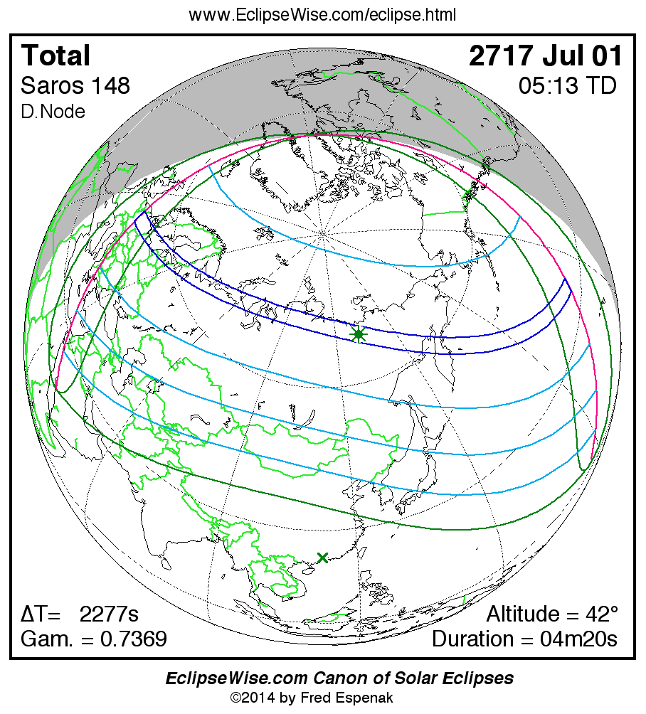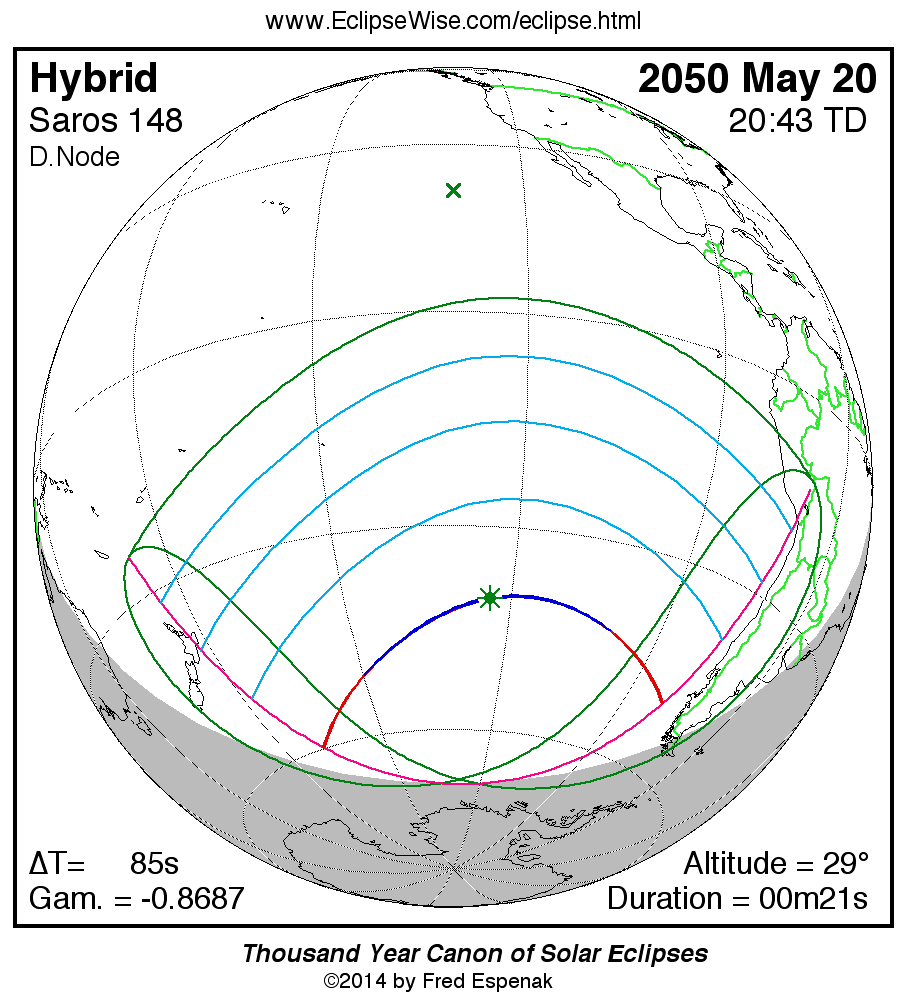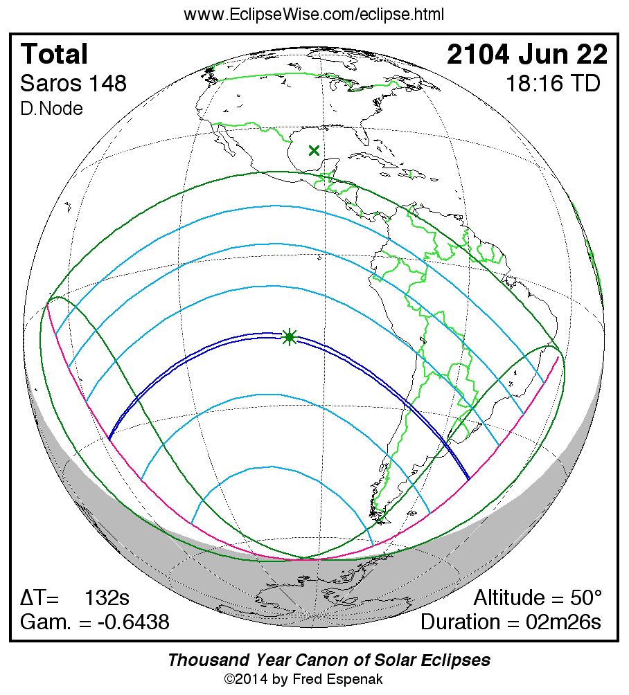 A panorama of all solar eclipses belonging to Saros 148 is presented here. Each map depicts the geographic region of visibility for a single eclipse. For central eclipses, the total or annular path is plotted in either blue (total) or red (annular). The date and time is given for the instant of Greatest Eclipse. Every map serves as a hyperlink to the EclipseWise Prime page for that eclipse where a larger map and complete details for the eclipse can be found. Visit the Key to Solar Eclipse Maps for a detailed explanation of these maps. Near the bottom of the page are a series of hyperlinks for more on solar eclipses.