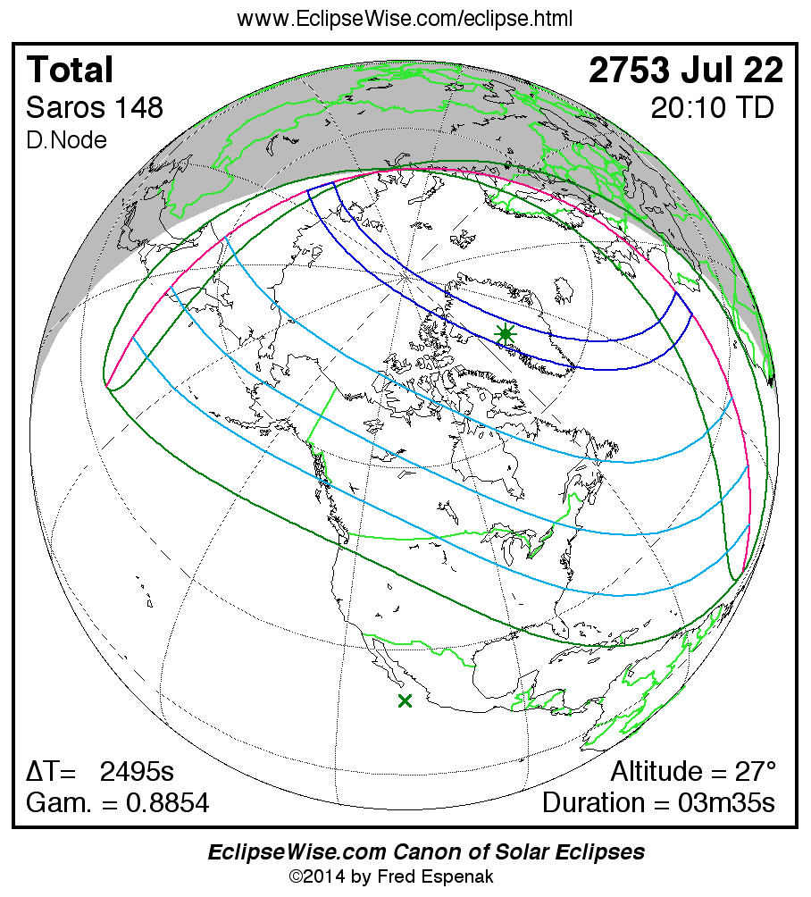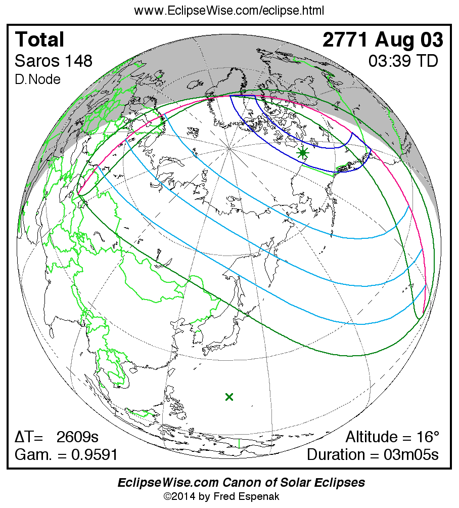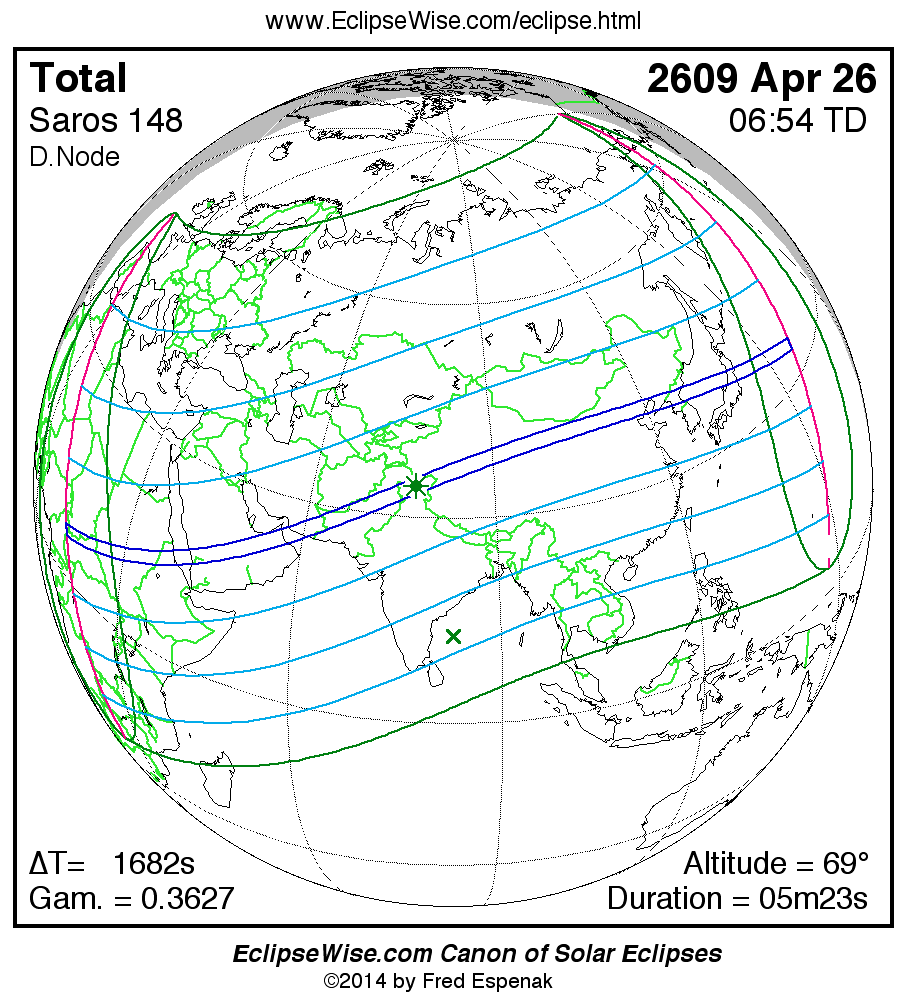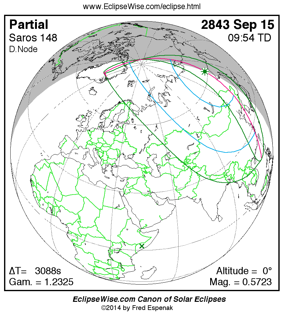 A panorama of all solar eclipses belonging to Saros 148 is presented here. Each map depicts the geographic region of visibility for a single eclipse. For central eclipses, the total or annular path is plotted in either blue (total) or red (annular). The date and time is given for the instant of Greatest Eclipse. Every map serves as a hyperlink to the EclipseWise Prime page for that eclipse where a larger map and complete details for the eclipse can be found. Visit the Key to Solar Eclipse Maps for a detailed explanation of these maps. Near the bottom of the page are a series of hyperlinks for more on solar eclipses.
