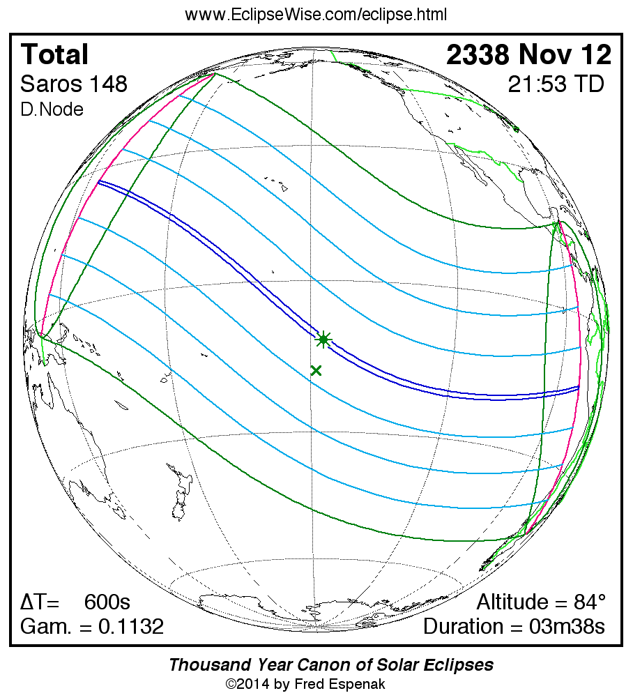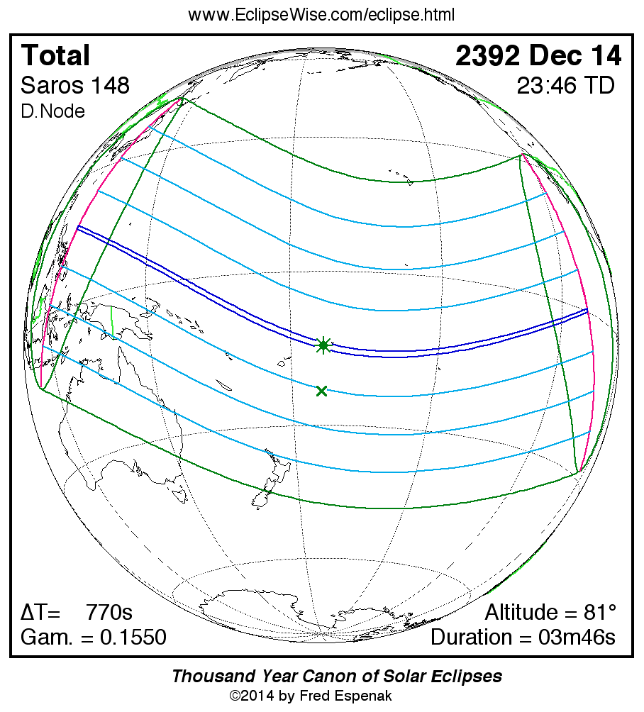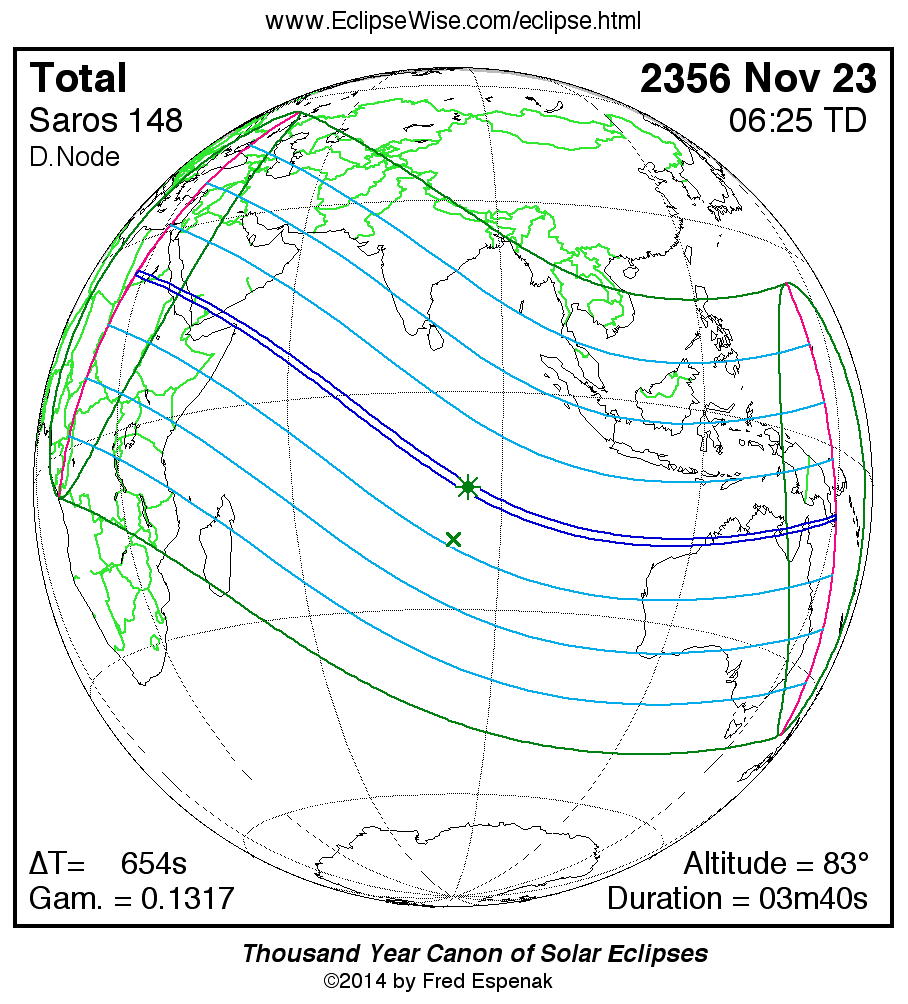The Saros panorama below is arranged in horizontal rows of 3 eclipses. So one eclipse to the left or right is a difference of 1 Saros cycle, and one eclipse above or below is a difference of 1 exeligmos. By scanning a column of the table, it reveals how the geographic visibility of eclipses separated by an exeligmos slowly changes.