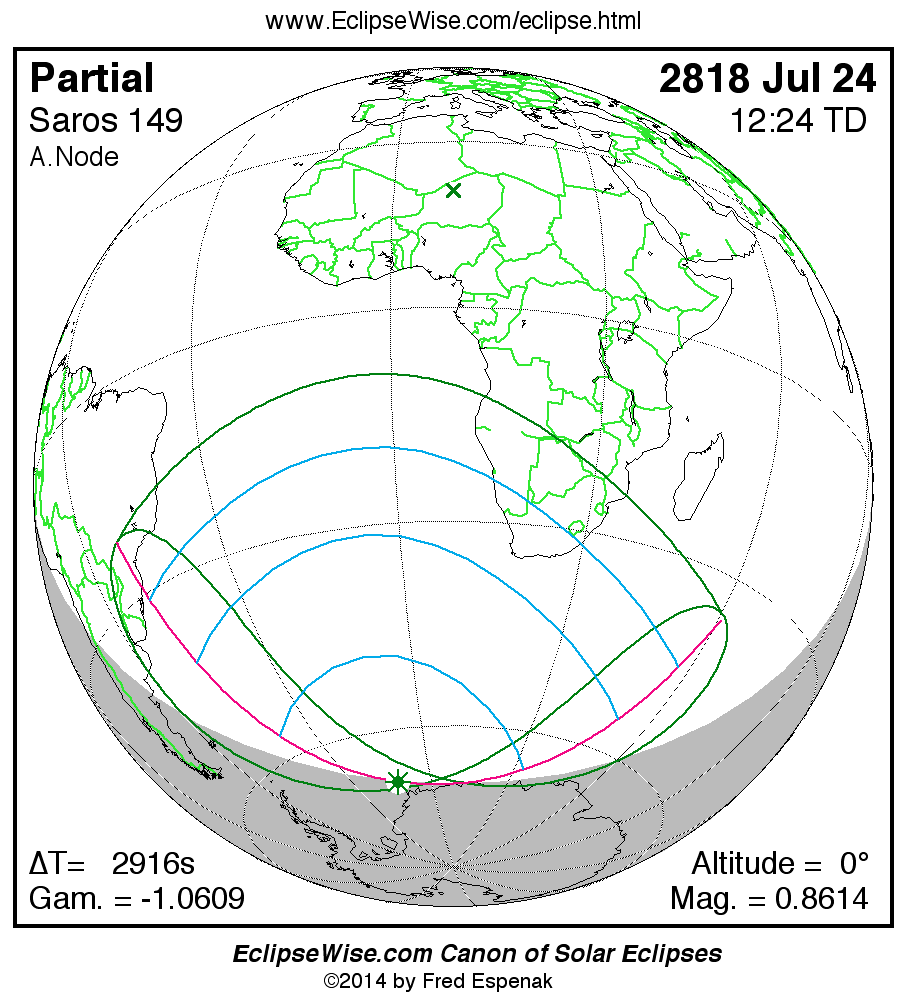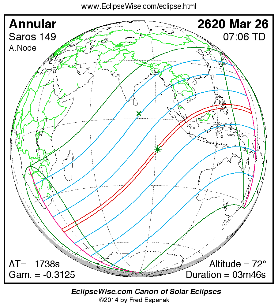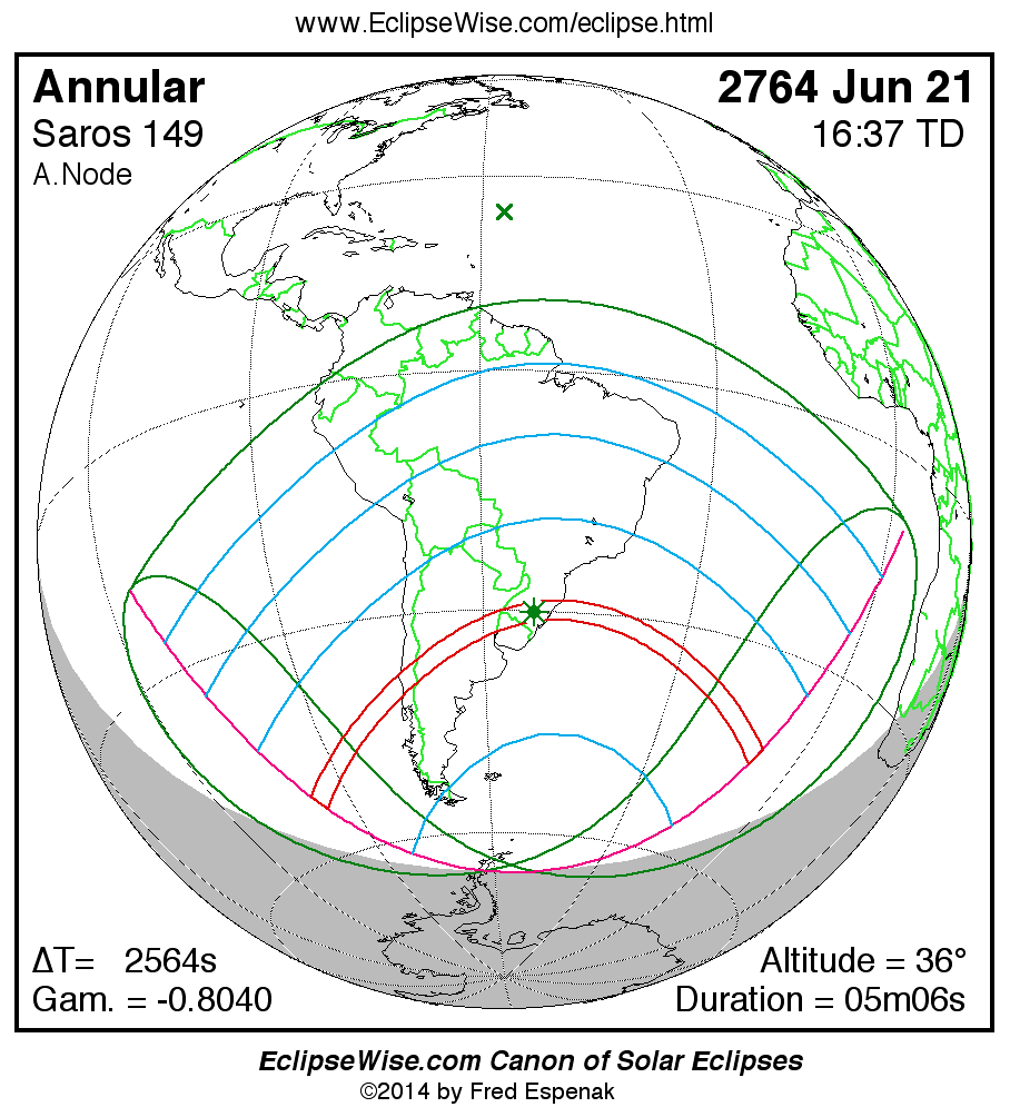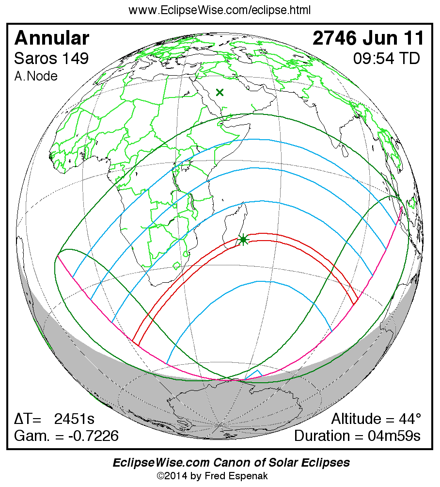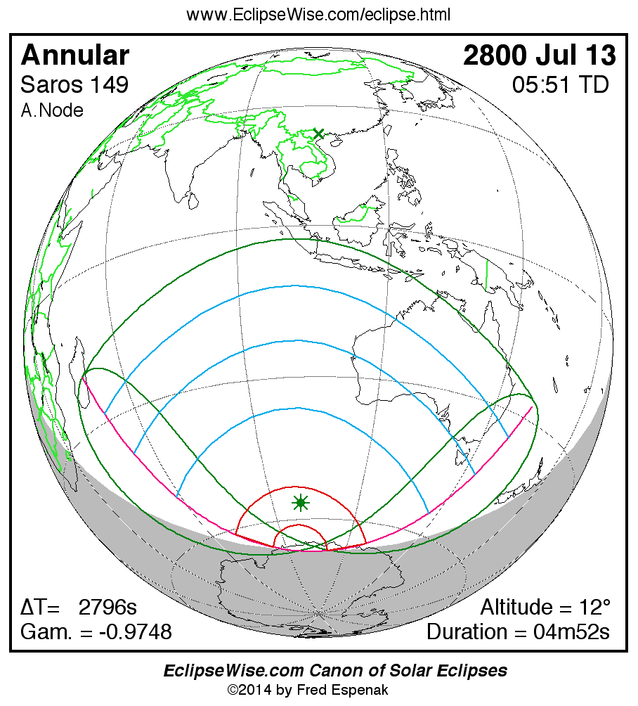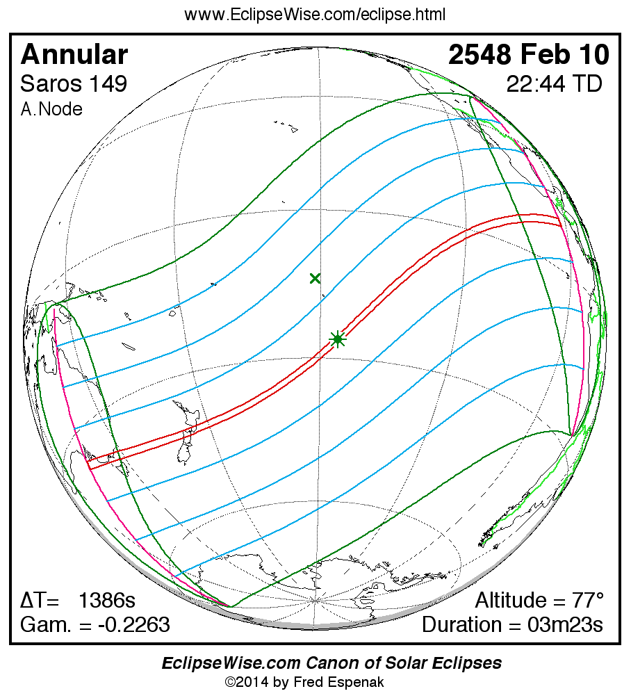 A panorama of all solar eclipses belonging to Saros 149 is presented here. Each map depicts the geographic region of visibility for a single eclipse. For central eclipses, the total or annular path is plotted in either blue (total) or red (annular). The date and time is given for the instant of Greatest Eclipse. Every map serves as a hyperlink to the EclipseWise Prime page for that eclipse where a larger map and complete details for the eclipse can be found. Visit the Key to Solar Eclipse Maps for a detailed explanation of these maps. Near the bottom of the page are a series of hyperlinks for more on solar eclipses.