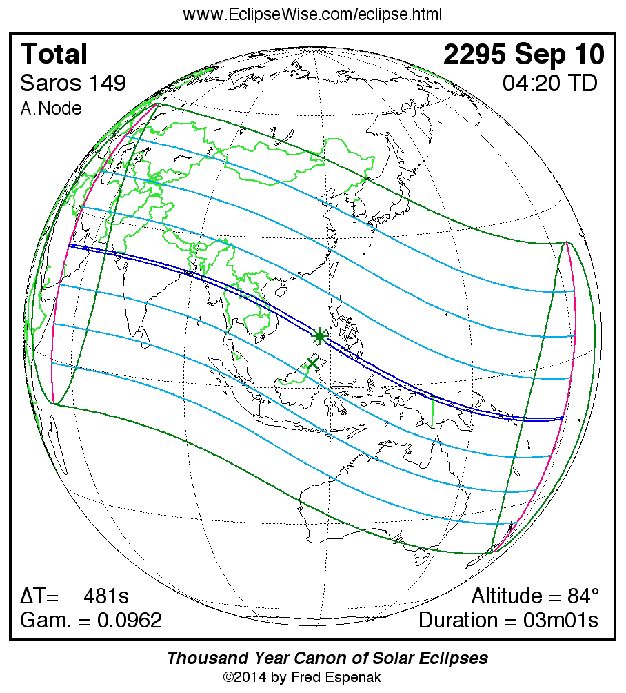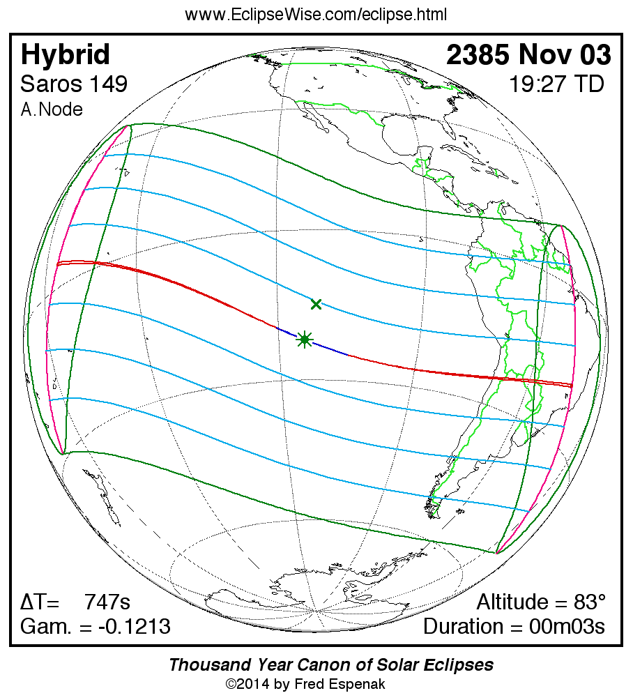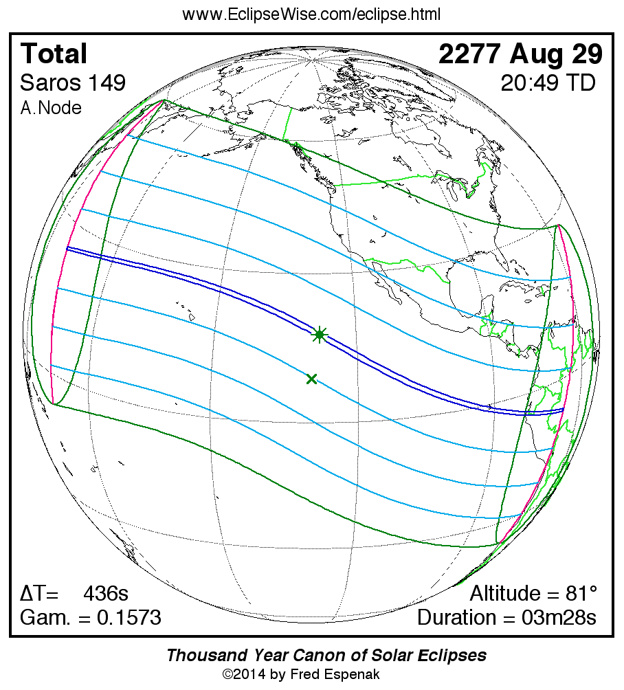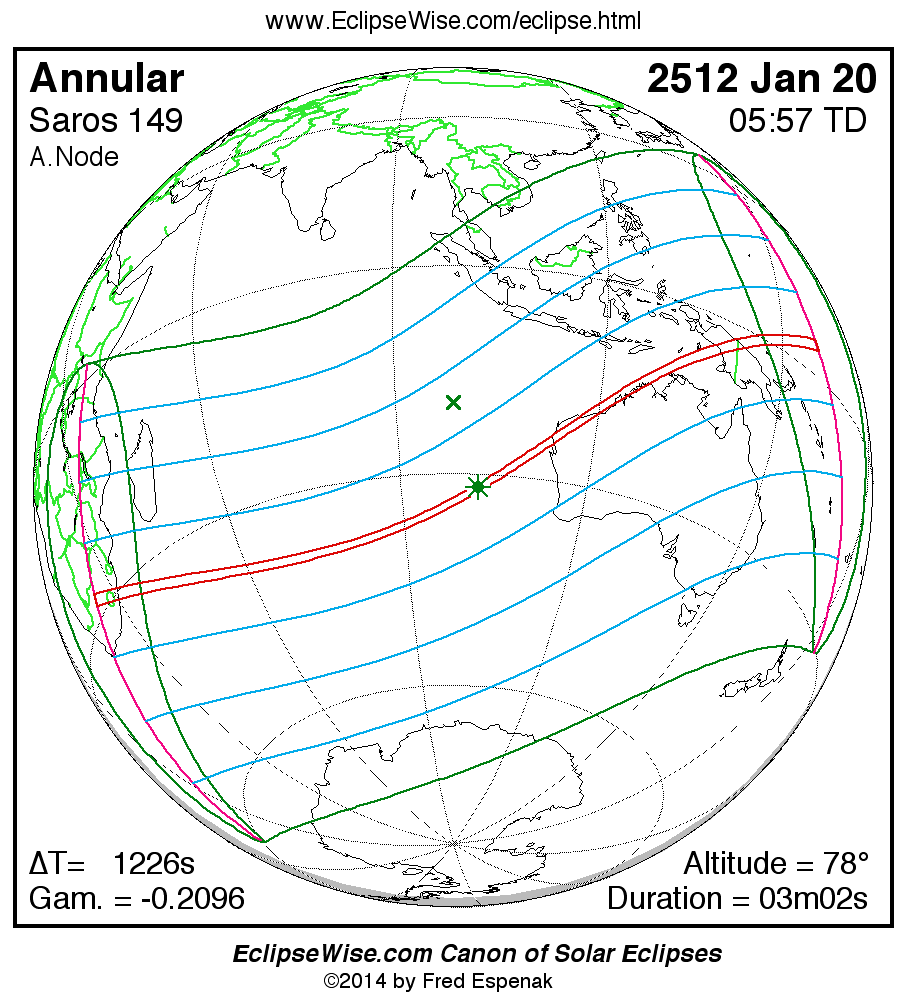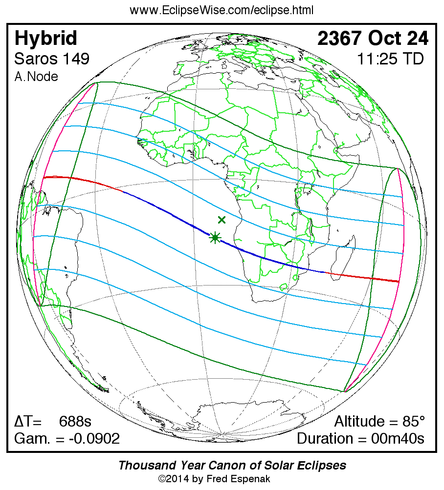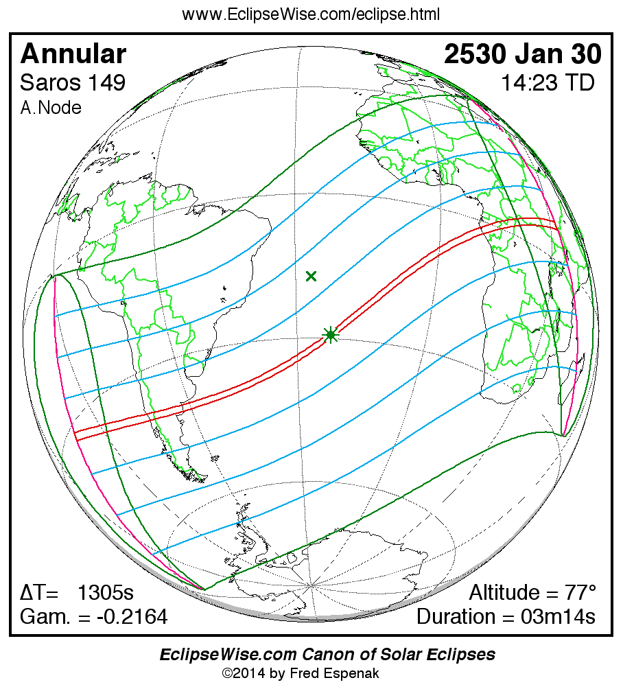 A panorama of all solar eclipses belonging to Saros 149 is presented here. Each map depicts the geographic region of visibility for a single eclipse. For central eclipses, the total or annular path is plotted in either blue (total) or red (annular). The date and time is given for the instant of Greatest Eclipse. Every map serves as a hyperlink to the EclipseWise Prime page for that eclipse where a larger map and complete details for the eclipse can be found. Visit the Key to Solar Eclipse Maps for a detailed explanation of these maps. Near the bottom of the page are a series of hyperlinks for more on solar eclipses.