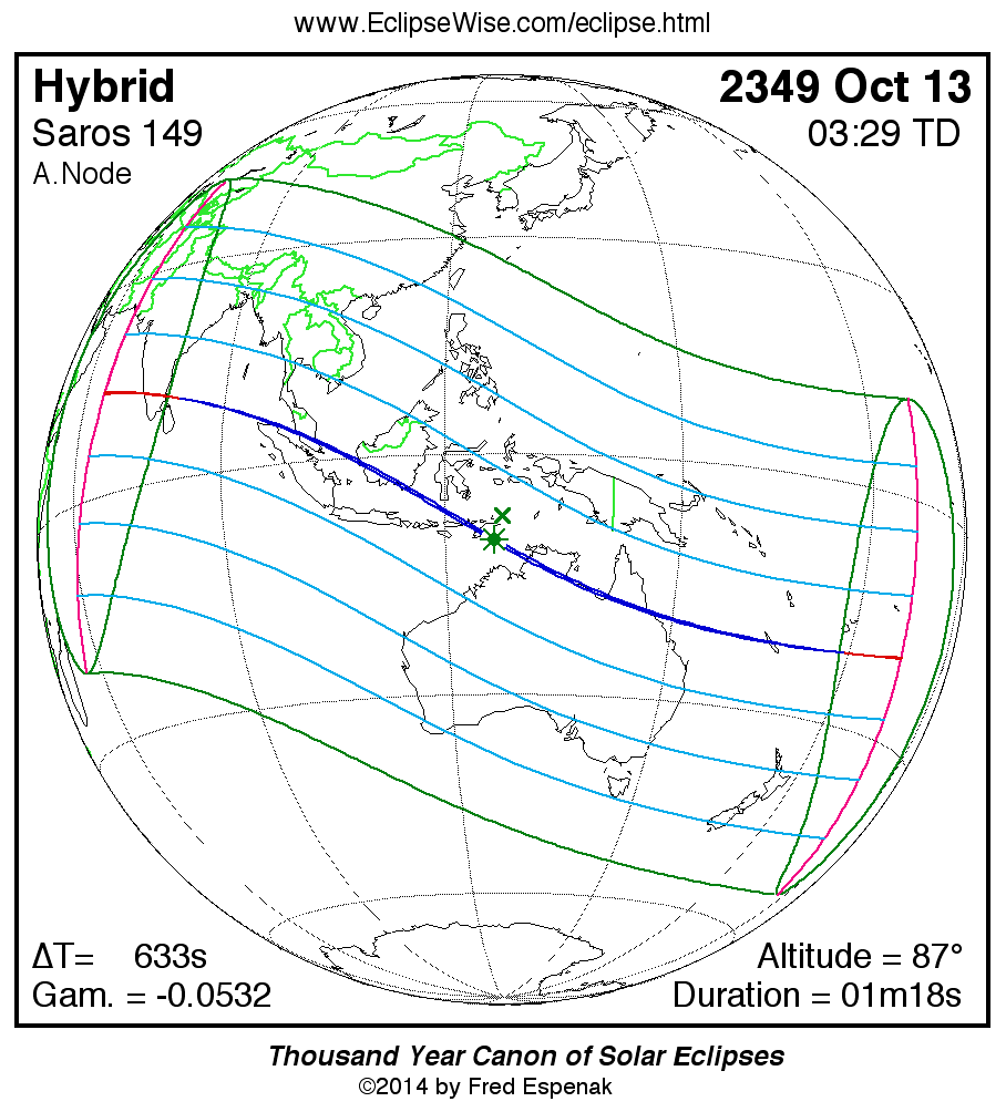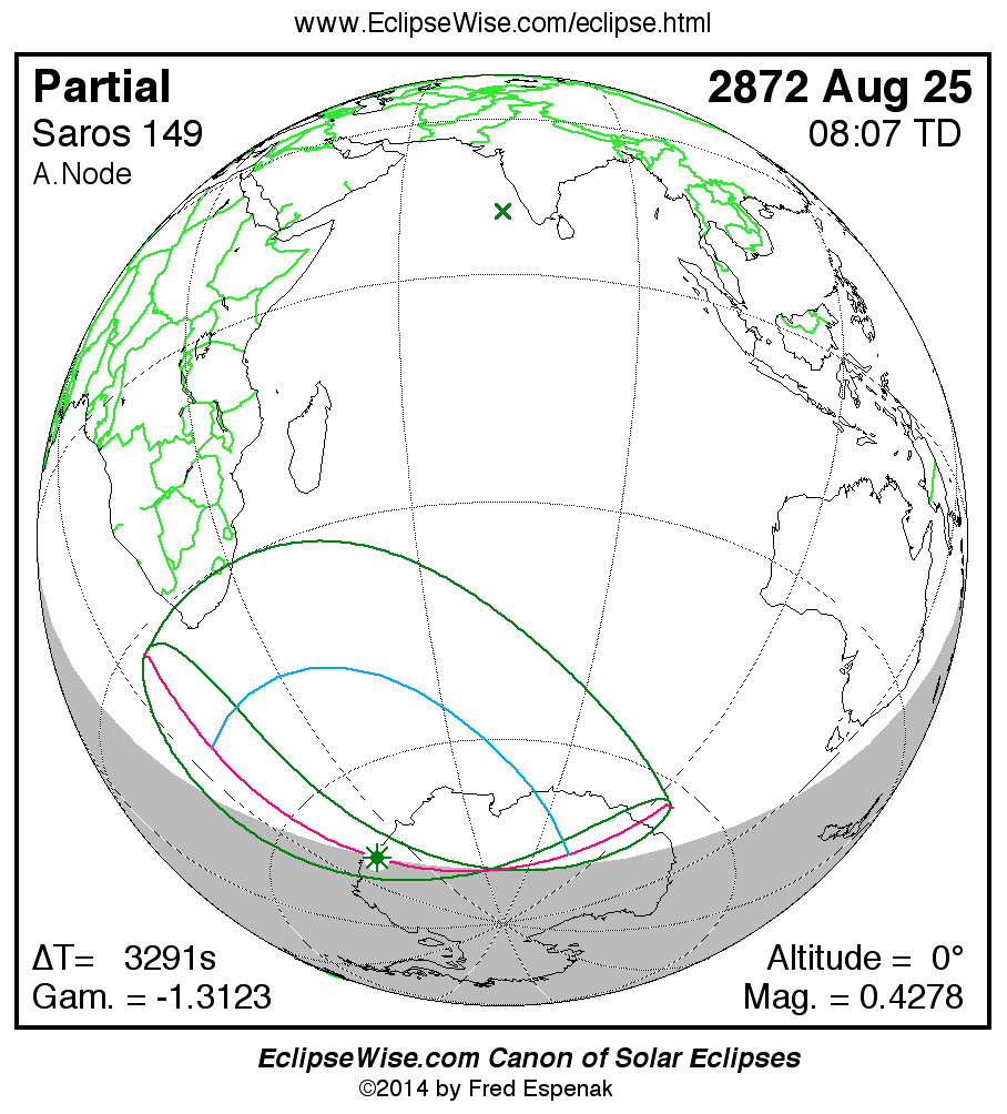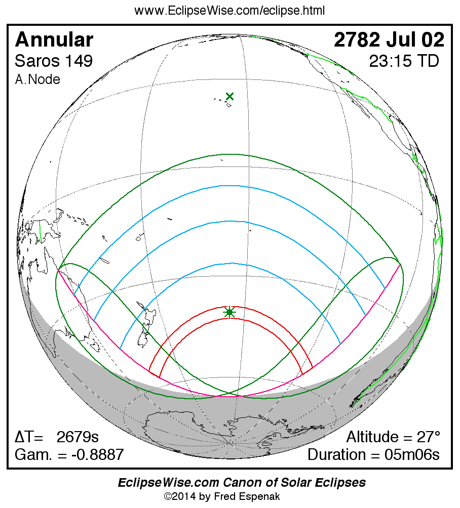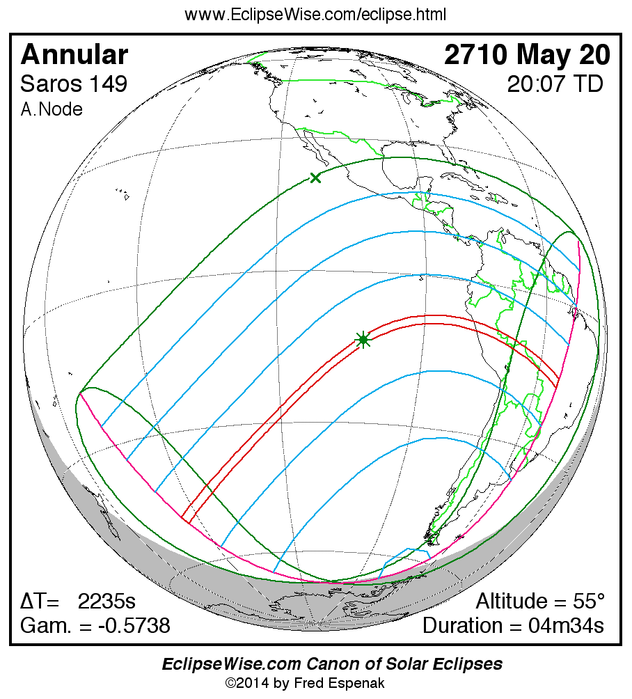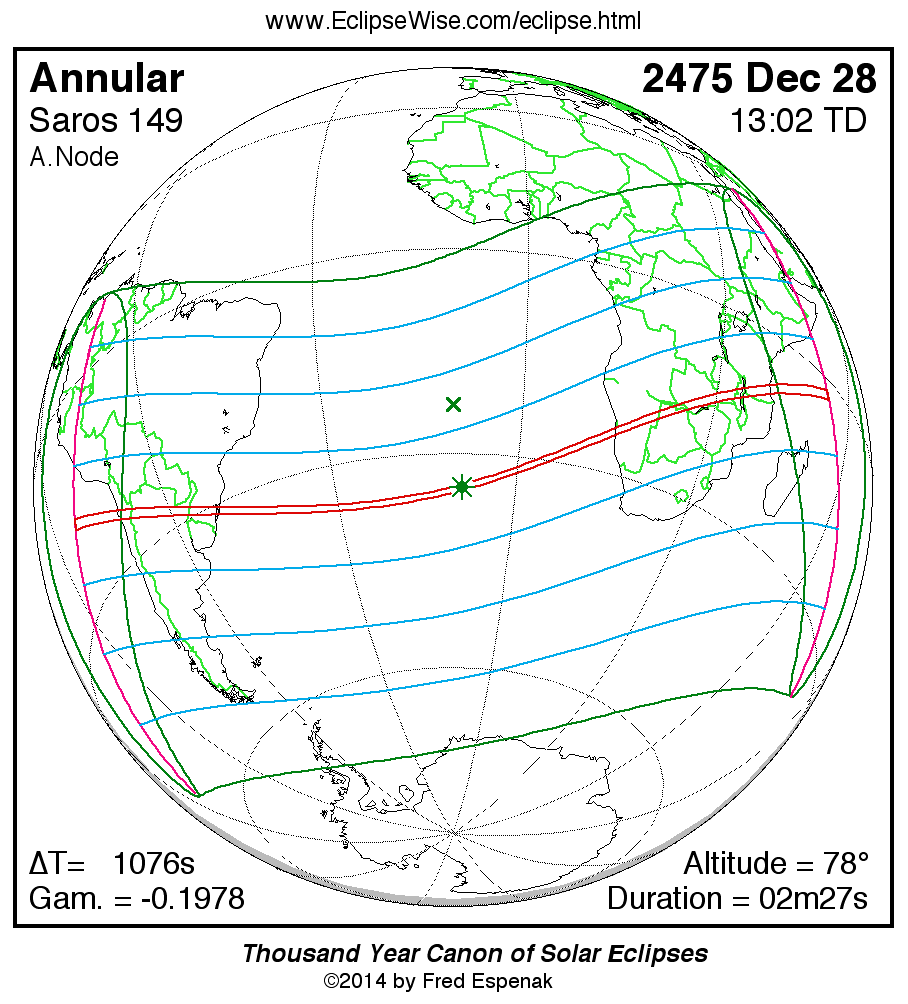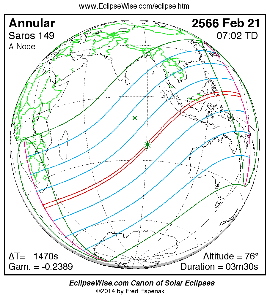A panorama of all solar eclipses belonging to Saros 149 is presented here. Each map depicts the geographic region of visibility for a single eclipse. For central eclipses, the total or annular path is plotted in either blue (total) or red (annular). The date and time is given for the instant of Greatest Eclipse. Every map serves as a hyperlink to the EclipseWise Prime page for that eclipse where a larger map and complete details for the eclipse can be found. Visit the Key to Solar Eclipse Maps for a detailed explanation of these maps. Near the bottom of the page are a series of hyperlinks for more on solar eclipses.
