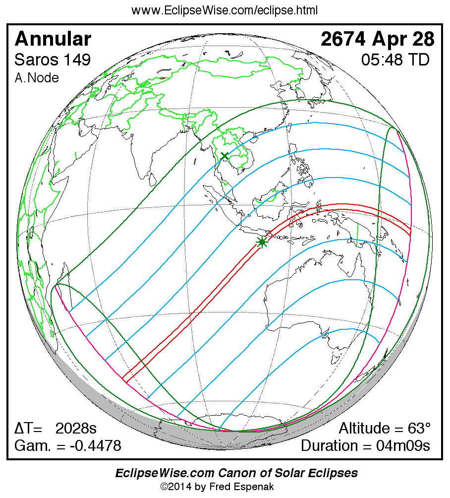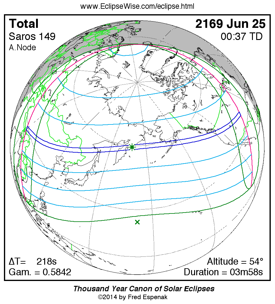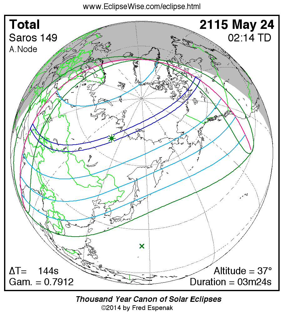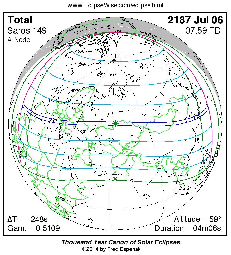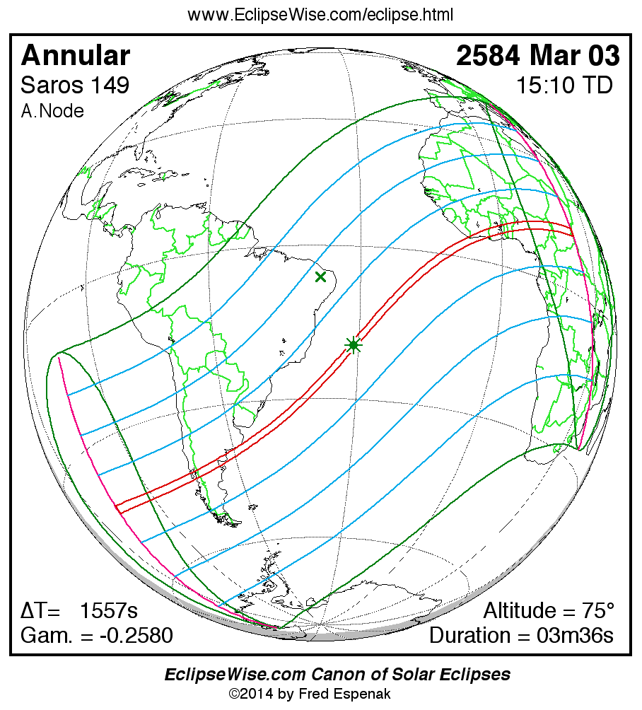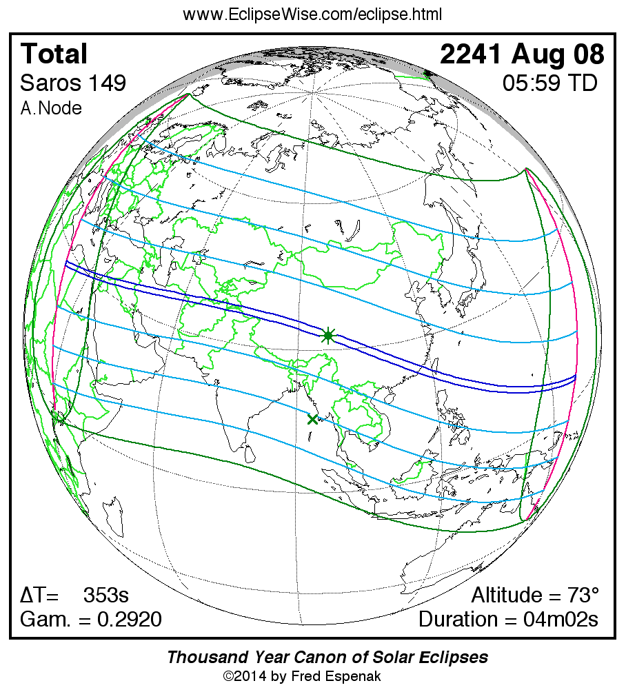 A panorama of all solar eclipses belonging to Saros 149 is presented here. Each map depicts the geographic region of visibility for a single eclipse. For central eclipses, the total or annular path is plotted in either blue (total) or red (annular). The date and time is given for the instant of Greatest Eclipse. Every map serves as a hyperlink to the EclipseWise Prime page for that eclipse where a larger map and complete details for the eclipse can be found. Visit the Key to Solar Eclipse Maps for a detailed explanation of these maps. Near the bottom of the page are a series of hyperlinks for more on solar eclipses.