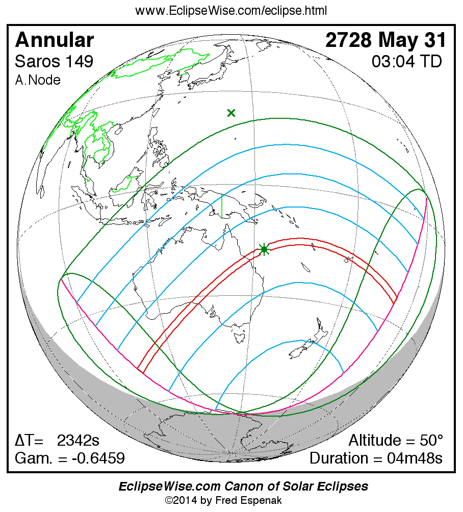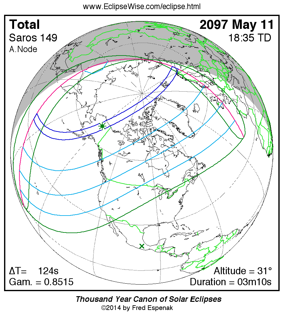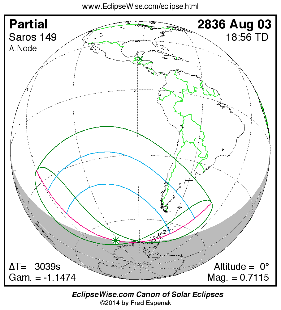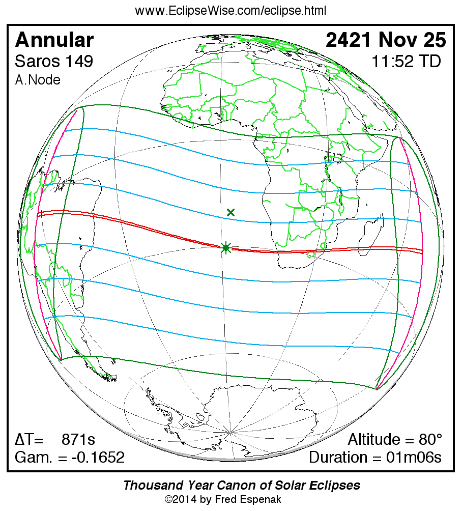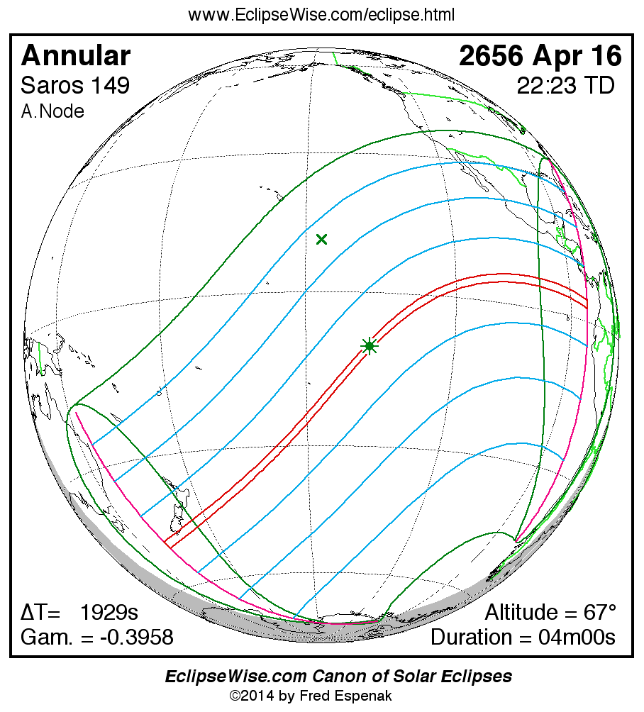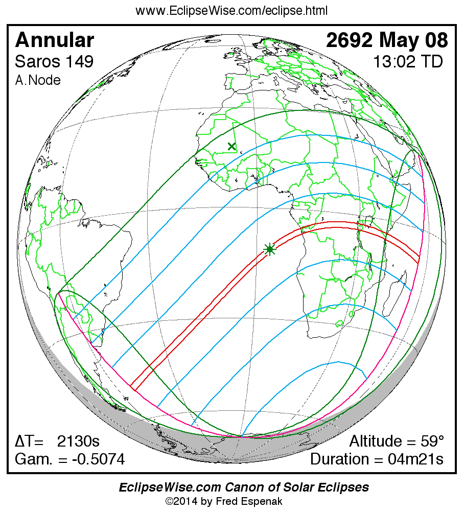 A panorama of all solar eclipses belonging to Saros 149 is presented here. Each map depicts the geographic region of visibility for a single eclipse. For central eclipses, the total or annular path is plotted in either blue (total) or red (annular). The date and time is given for the instant of Greatest Eclipse. Every map serves as a hyperlink to the EclipseWise Prime page for that eclipse where a larger map and complete details for the eclipse can be found. Visit the Key to Solar Eclipse Maps for a detailed explanation of these maps. Near the bottom of the page are a series of hyperlinks for more on solar eclipses.