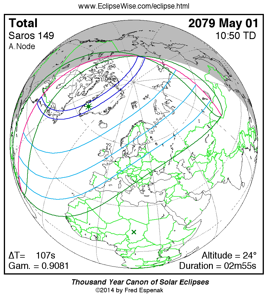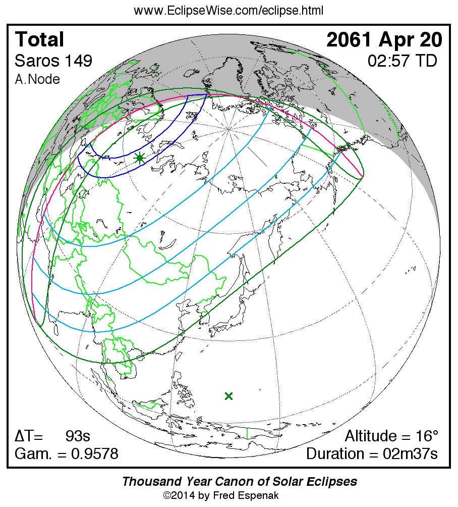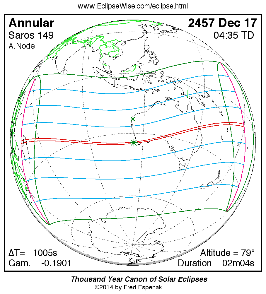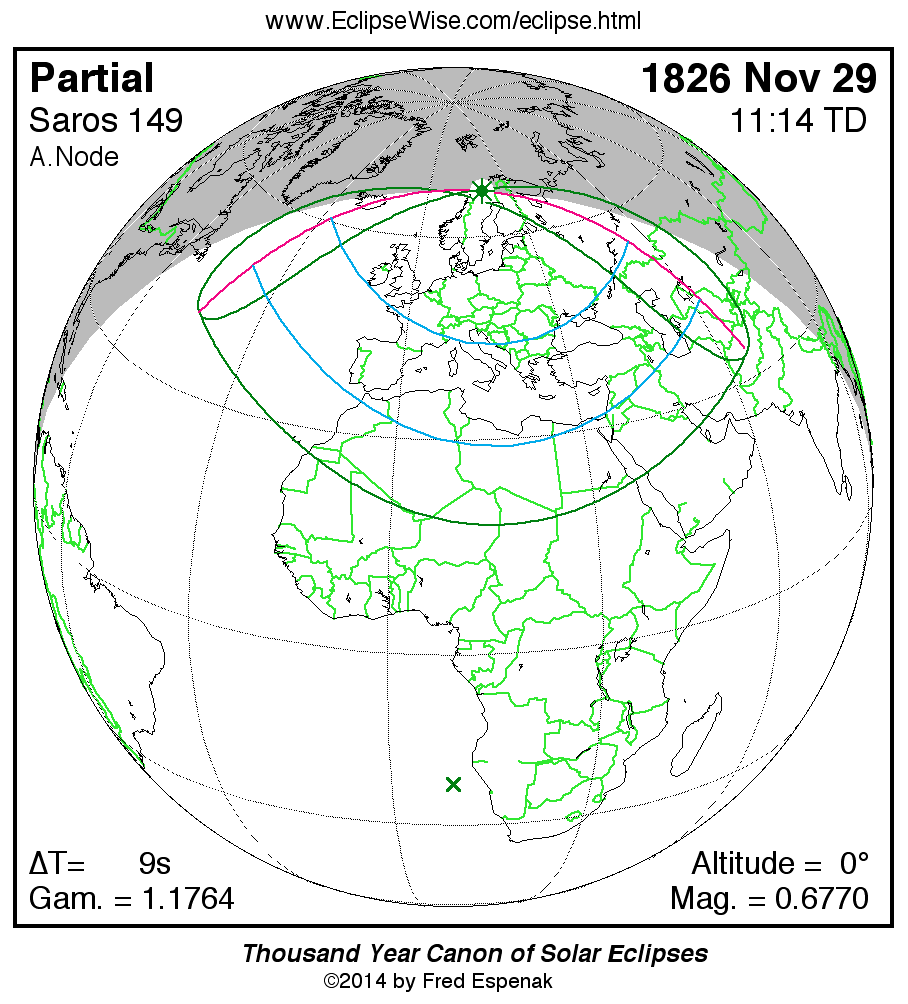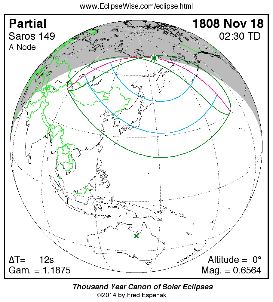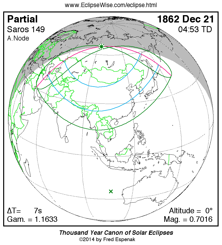 A panorama of all solar eclipses belonging to Saros 149 is presented here. Each map depicts the geographic region of visibility for a single eclipse. For central eclipses, the total or annular path is plotted in either blue (total) or red (annular). The date and time is given for the instant of Greatest Eclipse. Every map serves as a hyperlink to the EclipseWise Prime page for that eclipse where a larger map and complete details for the eclipse can be found. Visit the Key to Solar Eclipse Maps for a detailed explanation of these maps. Near the bottom of the page are a series of hyperlinks for more on solar eclipses.