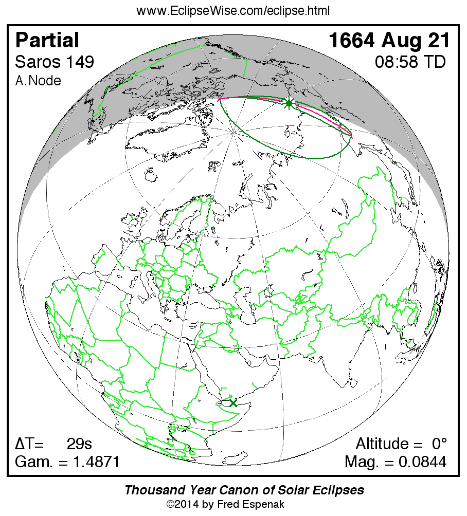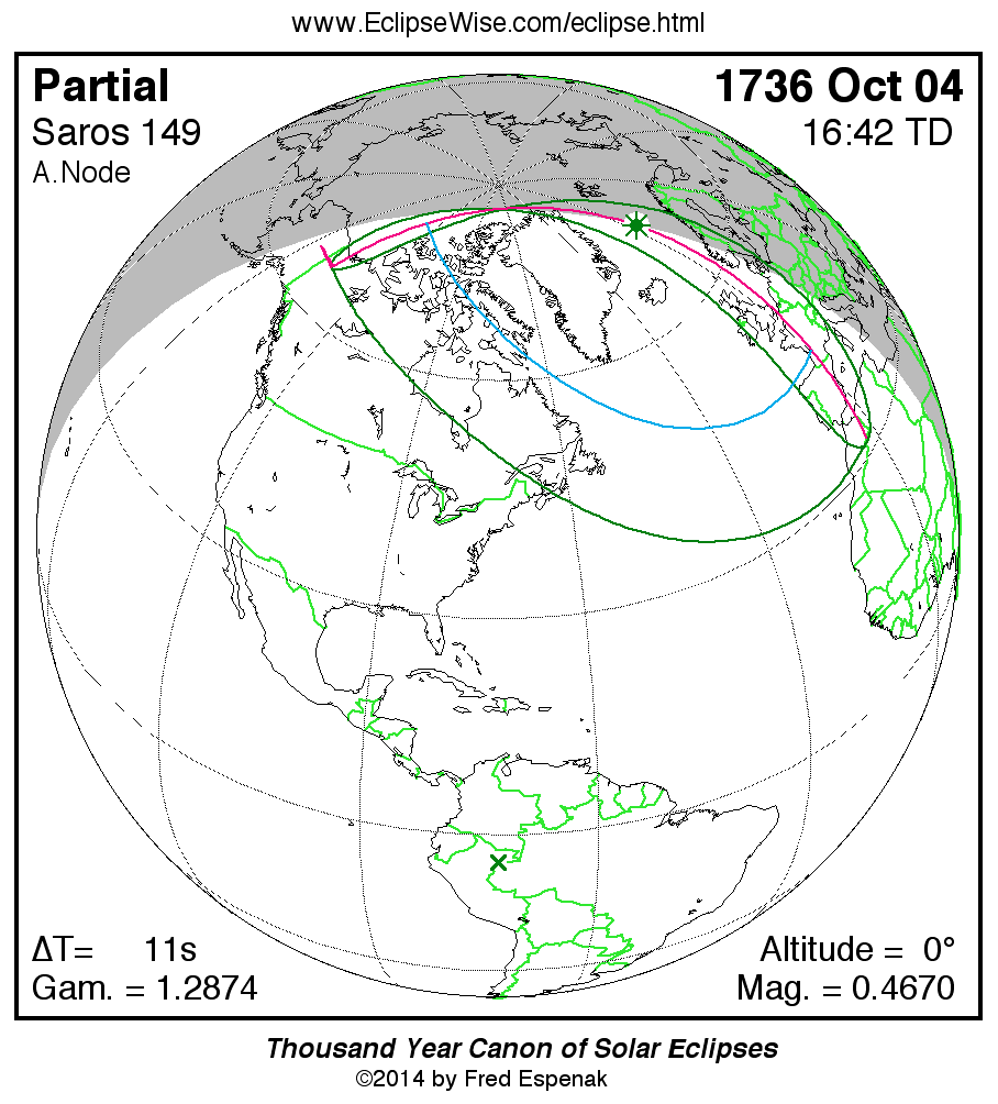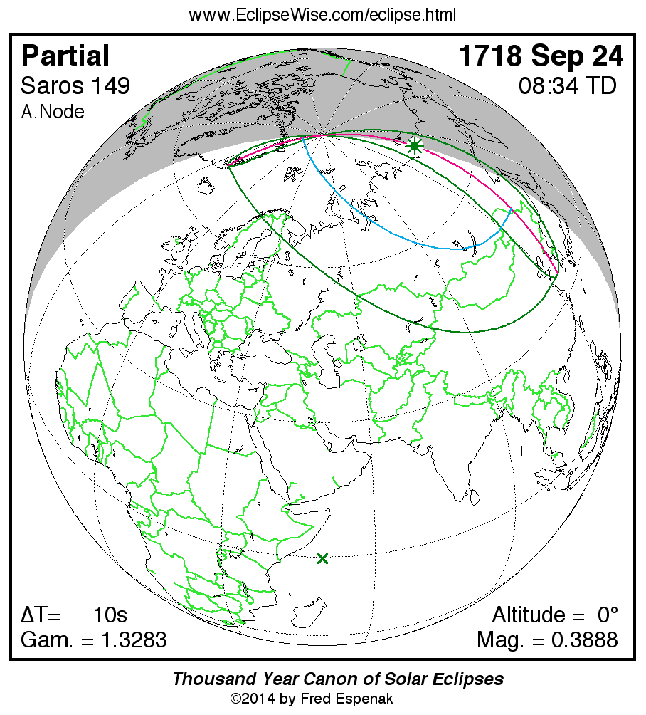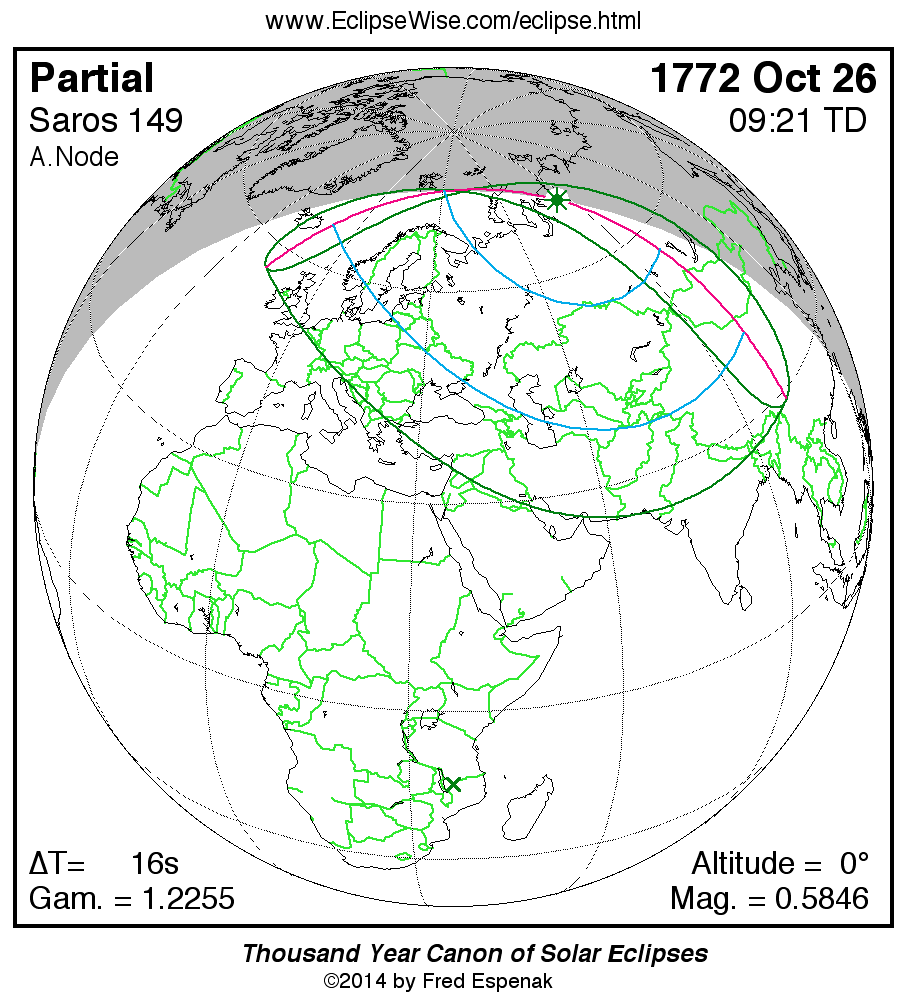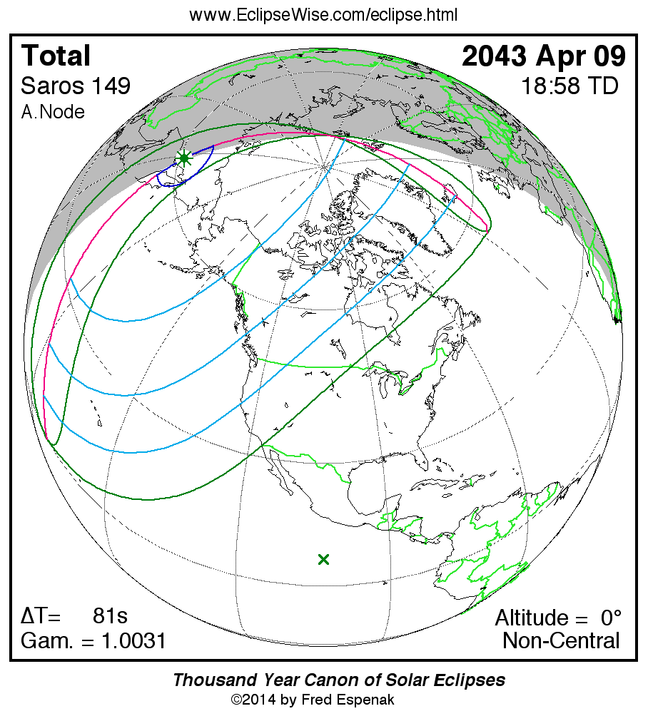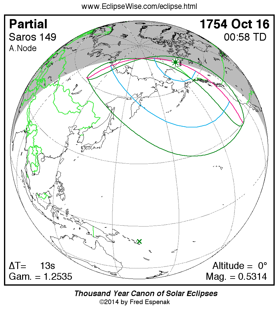 A panorama of all solar eclipses belonging to Saros 149 is presented here. Each map depicts the geographic region of visibility for a single eclipse. For central eclipses, the total or annular path is plotted in either blue (total) or red (annular). The date and time is given for the instant of Greatest Eclipse. Every map serves as a hyperlink to the EclipseWise Prime page for that eclipse where a larger map and complete details for the eclipse can be found. Visit the Key to Solar Eclipse Maps for a detailed explanation of these maps. Near the bottom of the page are a series of hyperlinks for more on solar eclipses.