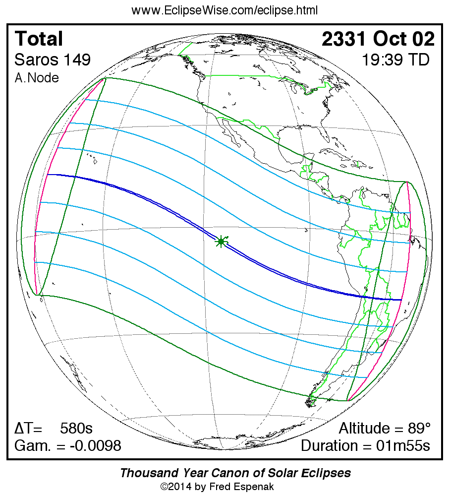 The Saros panorama below is arranged in horizontal rows of 3 eclipses. So one eclipse to the left or right is a difference of 1 Saros cycle, and one eclipse above or below is a difference of 1 exeligmos. By scanning a column of the table, it reveals how the geographic visibility of eclipses separated by an exeligmos slowly changes.