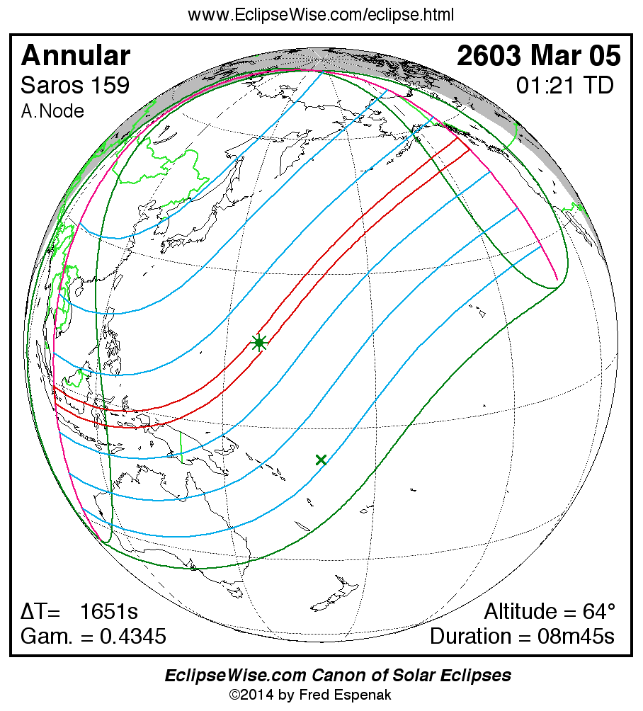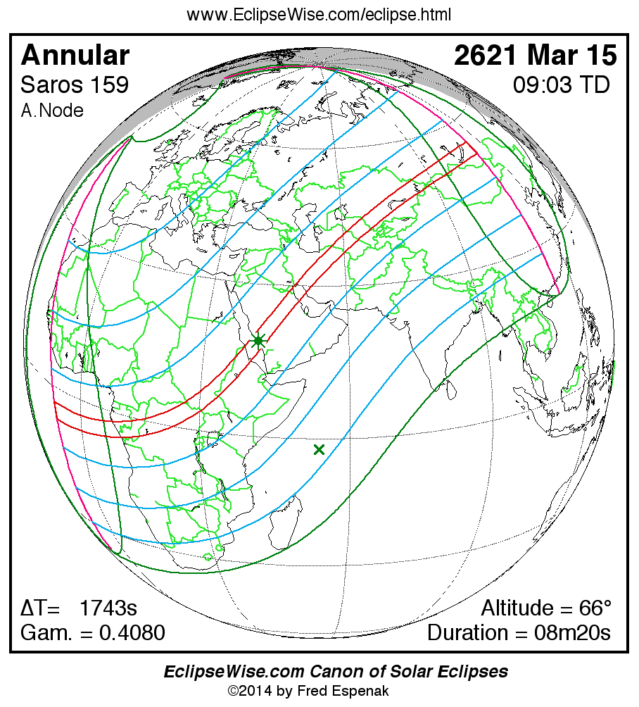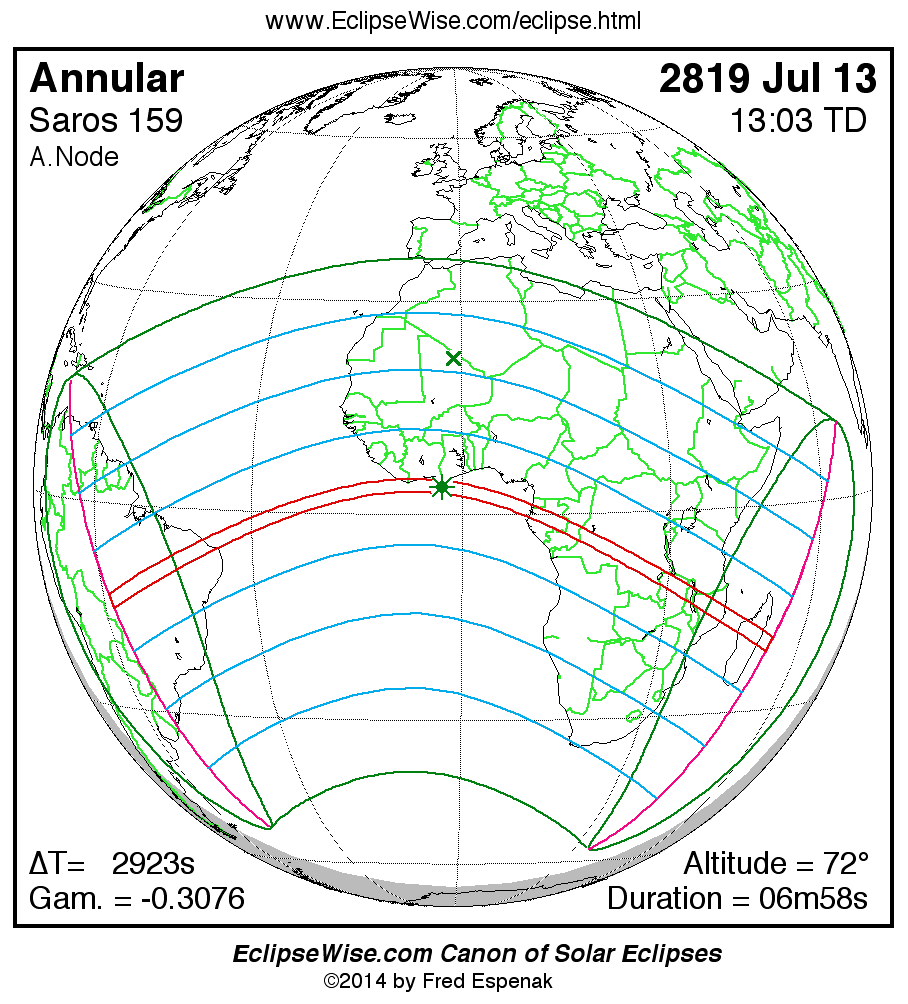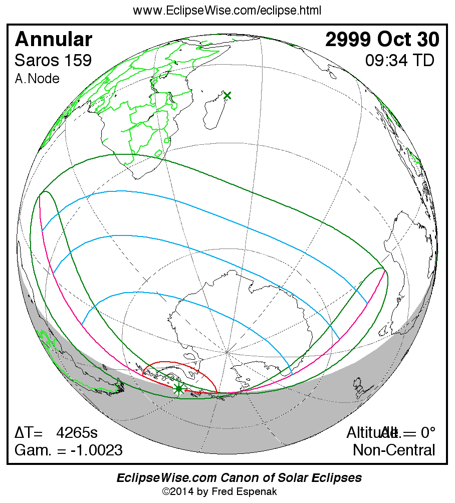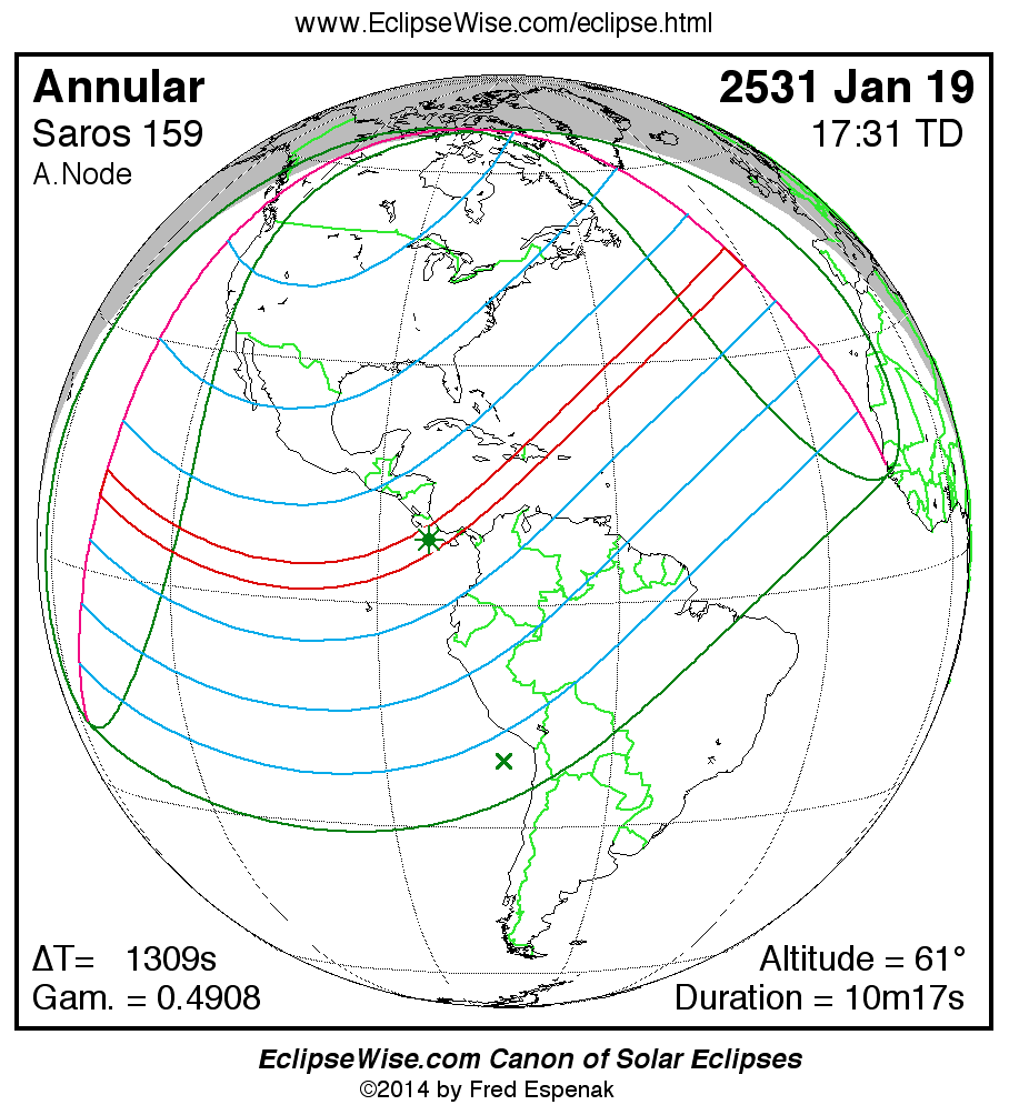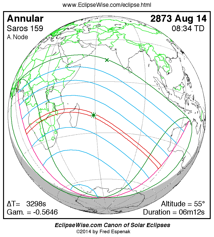 A panorama of all solar eclipses belonging to Saros 159 is presented here. Each map depicts the geographic region of visibility for a single eclipse. For central eclipses, the total or annular path is plotted in either blue (total) or red (annular). The date and time is given for the instant of Greatest Eclipse. Every map serves as a hyperlink to the EclipseWise Prime page for that eclipse where a larger map and complete details for the eclipse can be found. Visit the Key to Solar Eclipse Maps for a detailed explanation of these maps. Near the bottom of the page are a series of hyperlinks for more on solar eclipses.