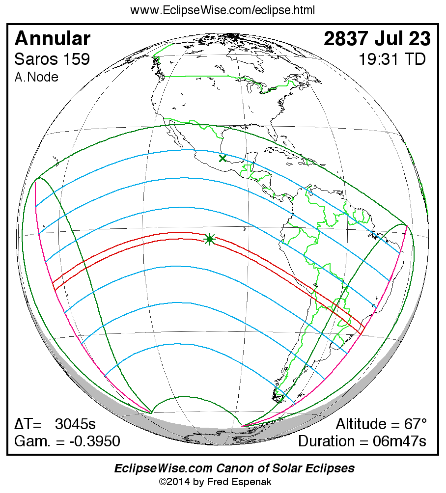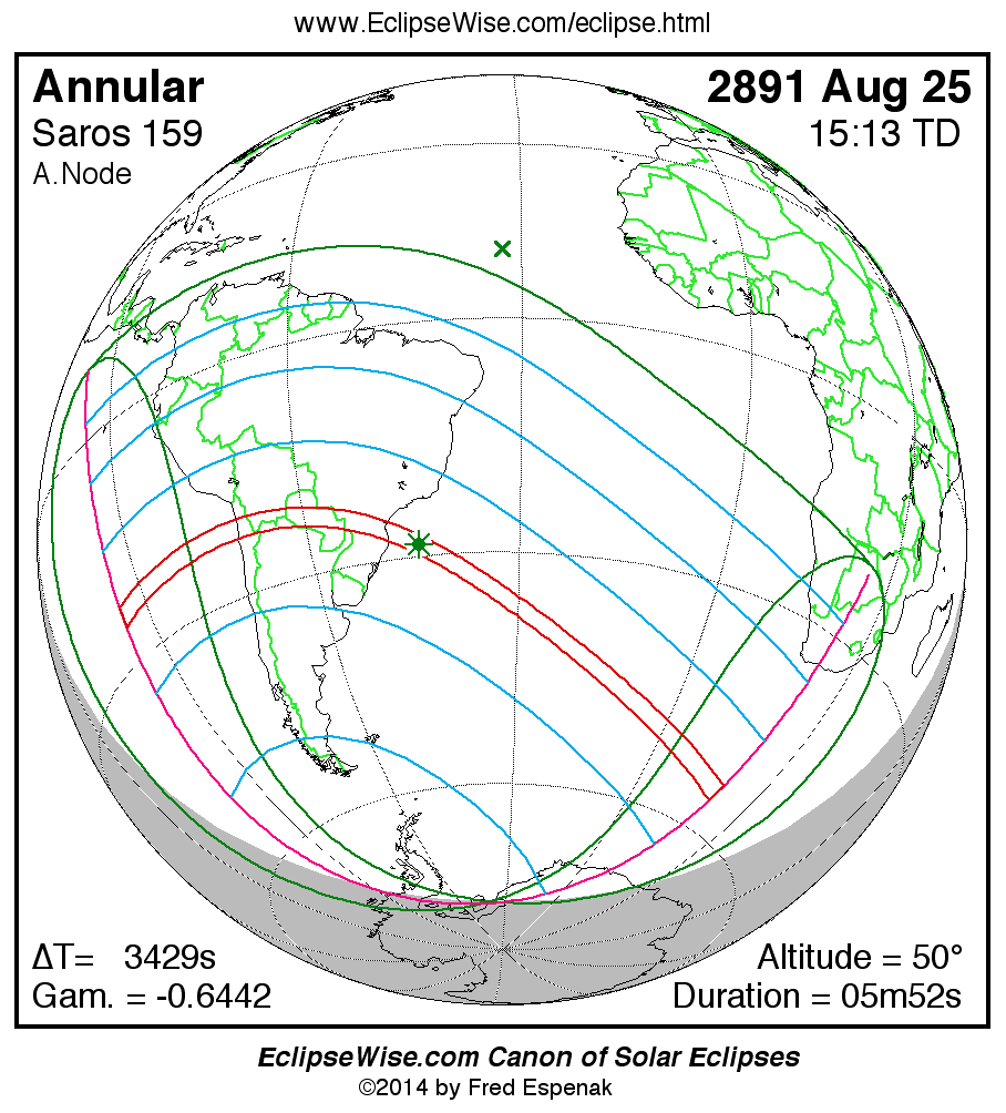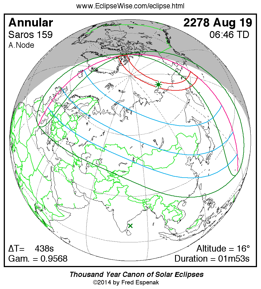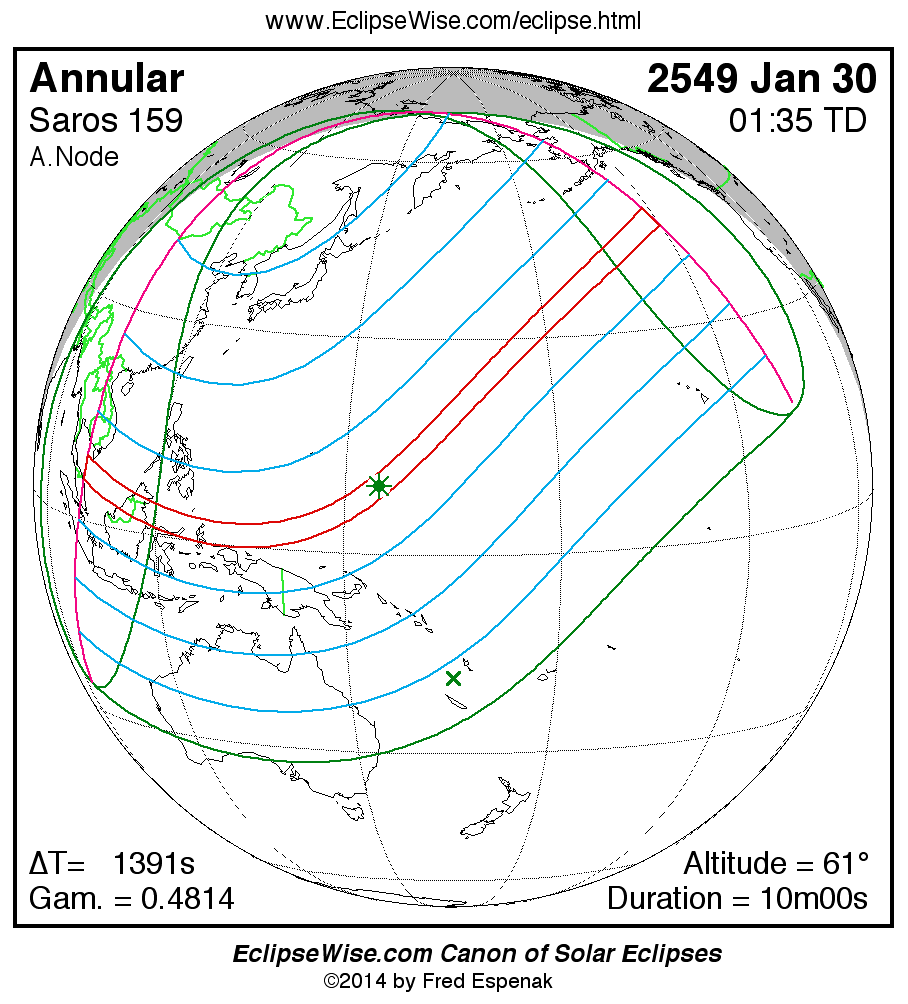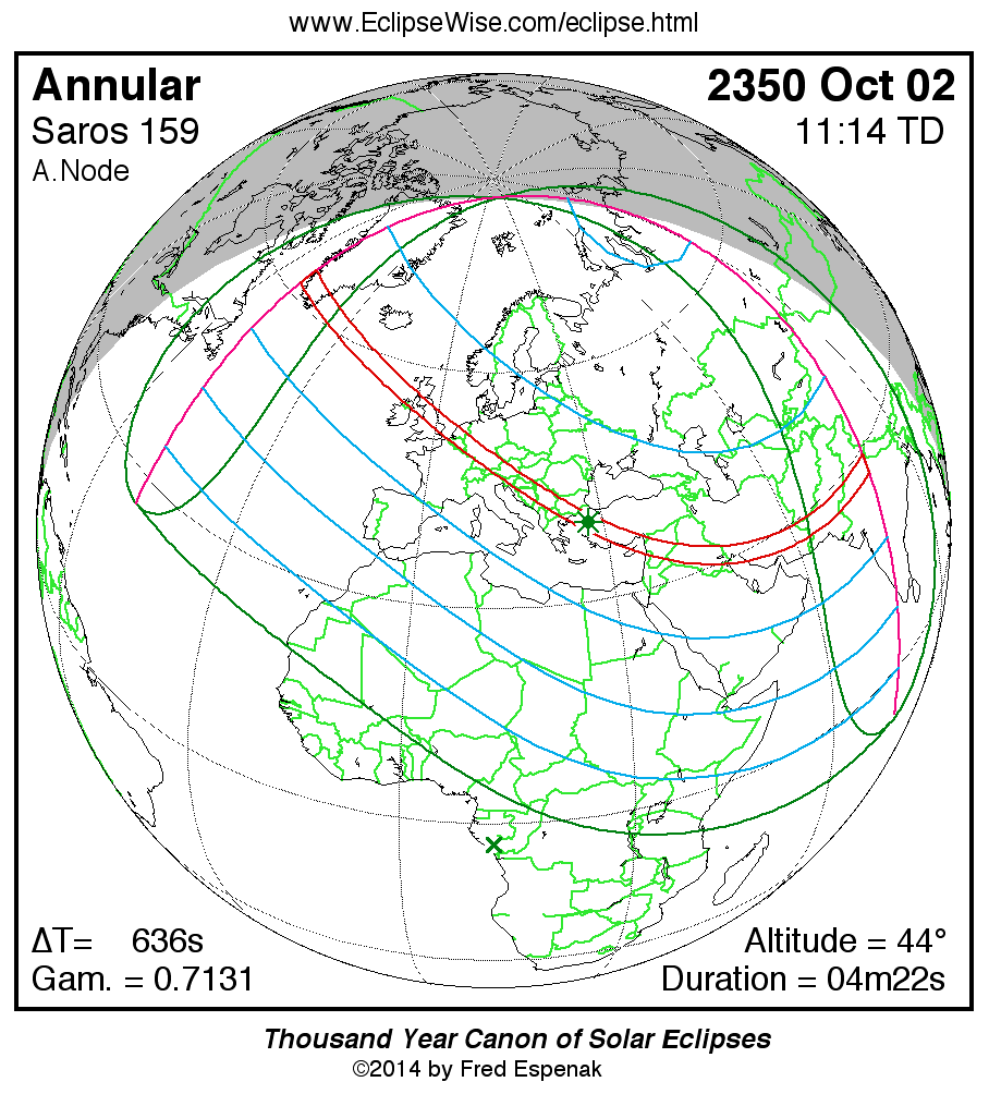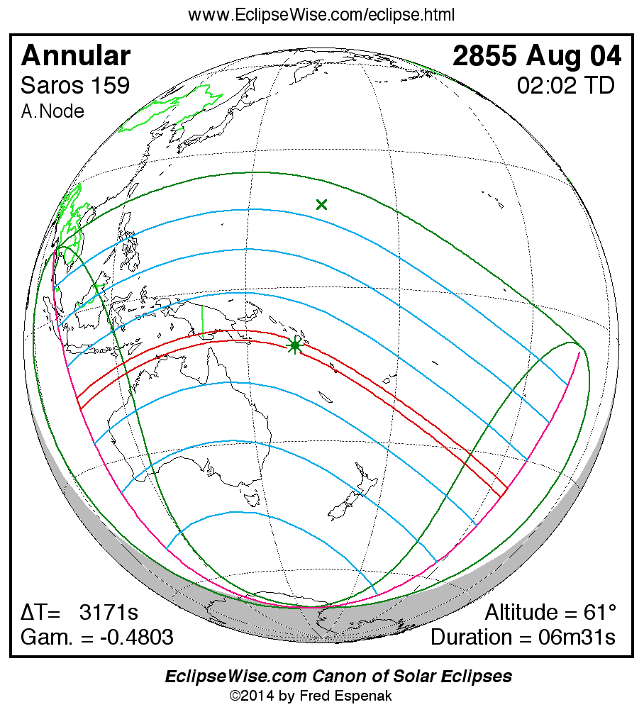 A panorama of all solar eclipses belonging to Saros 159 is presented here. Each map depicts the geographic region of visibility for a single eclipse. For central eclipses, the total or annular path is plotted in either blue (total) or red (annular). The date and time is given for the instant of Greatest Eclipse. Every map serves as a hyperlink to the EclipseWise Prime page for that eclipse where a larger map and complete details for the eclipse can be found. Visit the Key to Solar Eclipse Maps for a detailed explanation of these maps. Near the bottom of the page are a series of hyperlinks for more on solar eclipses.