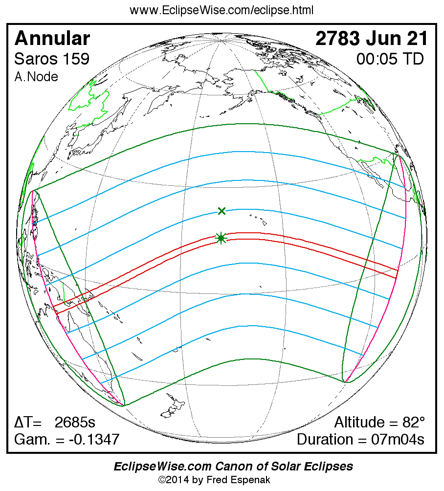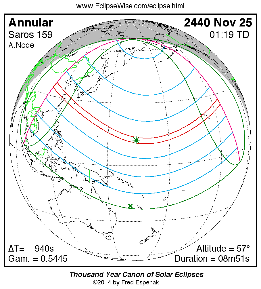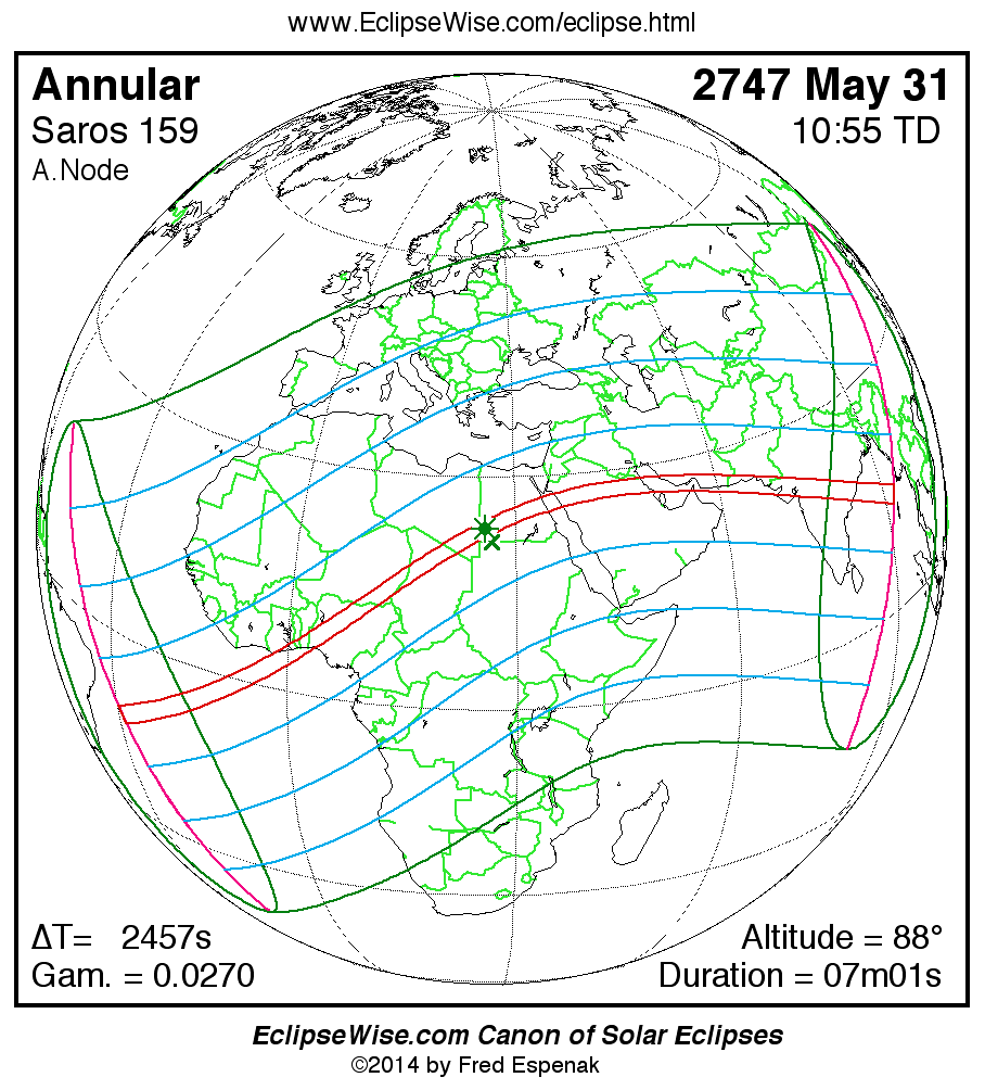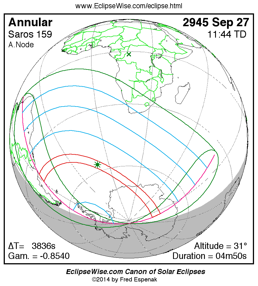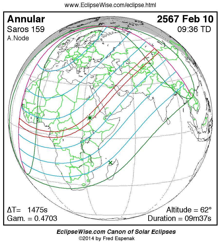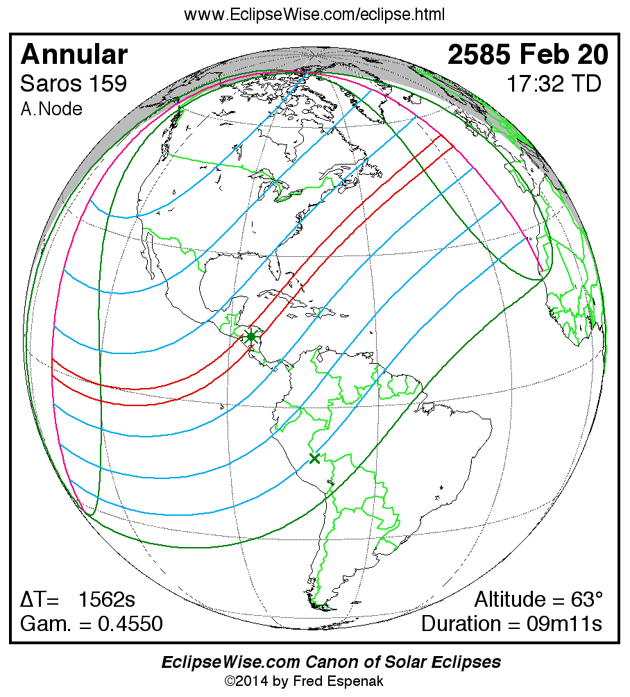 A panorama of all solar eclipses belonging to Saros 159 is presented here. Each map depicts the geographic region of visibility for a single eclipse. For central eclipses, the total or annular path is plotted in either blue (total) or red (annular). The date and time is given for the instant of Greatest Eclipse. Every map serves as a hyperlink to the EclipseWise Prime page for that eclipse where a larger map and complete details for the eclipse can be found. Visit the Key to Solar Eclipse Maps for a detailed explanation of these maps. Near the bottom of the page are a series of hyperlinks for more on solar eclipses.