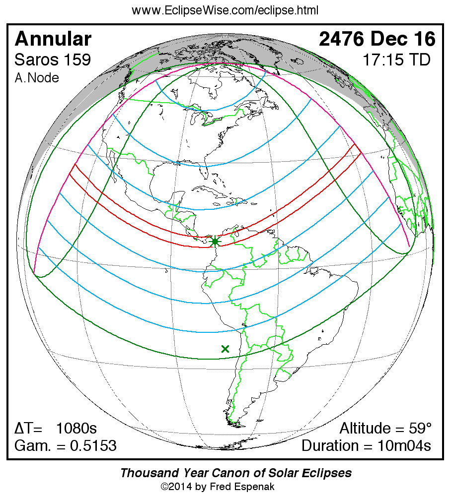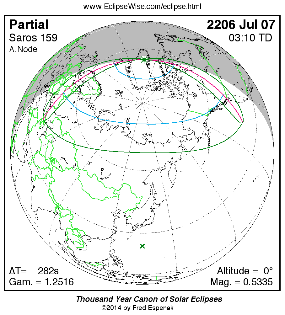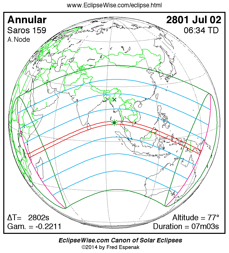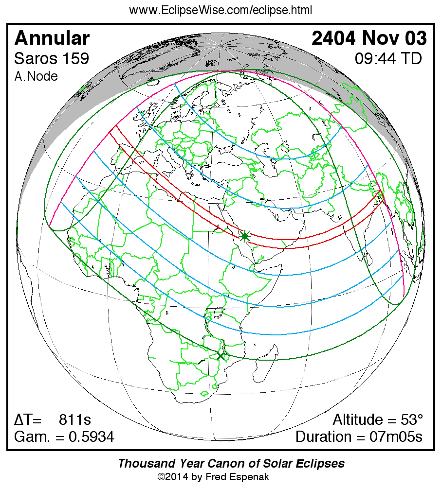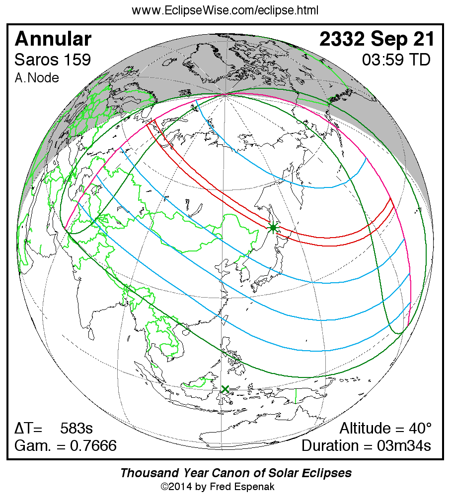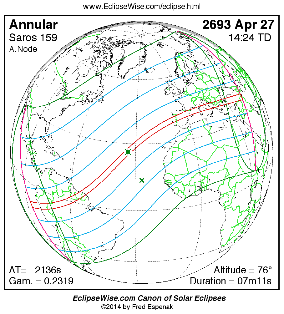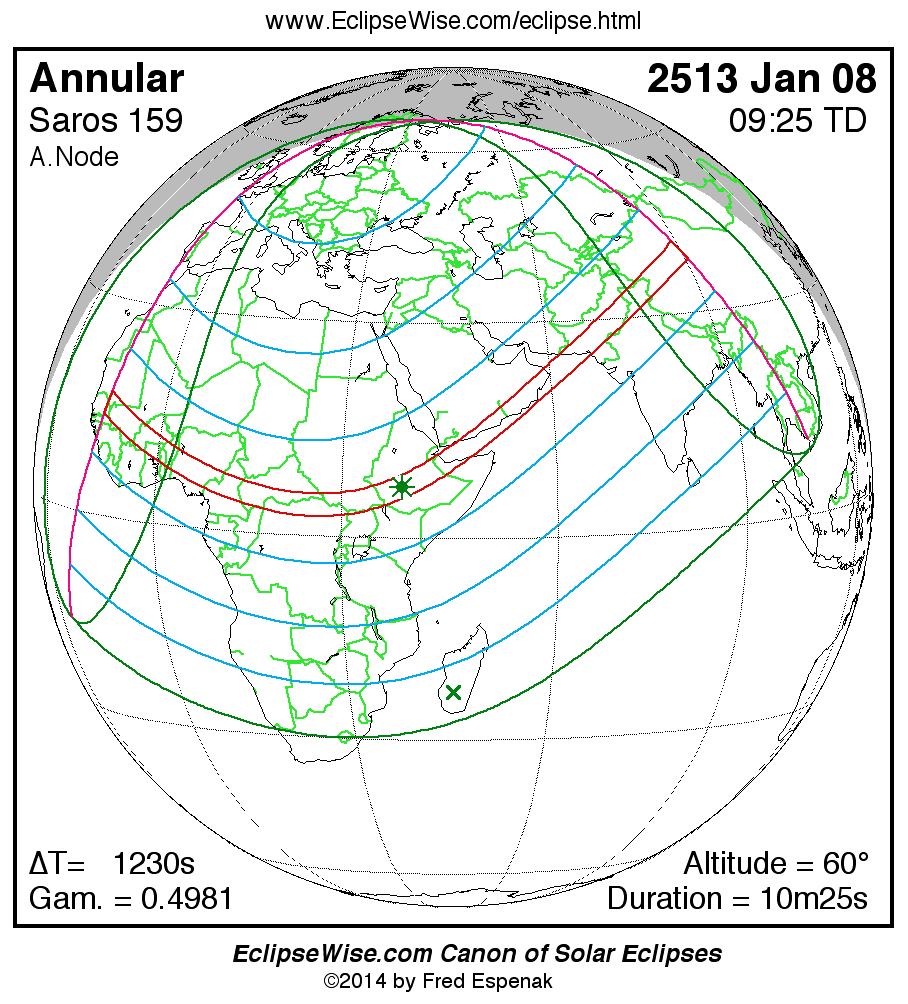 A panorama of all solar eclipses belonging to Saros 159 is presented here. Each map depicts the geographic region of visibility for a single eclipse. For central eclipses, the total or annular path is plotted in either blue (total) or red (annular). The date and time is given for the instant of Greatest Eclipse. Every map serves as a hyperlink to the EclipseWise Prime page for that eclipse where a larger map and complete details for the eclipse can be found. Visit the Key to Solar Eclipse Maps for a detailed explanation of these maps. Near the bottom of the page are a series of hyperlinks for more on solar eclipses.