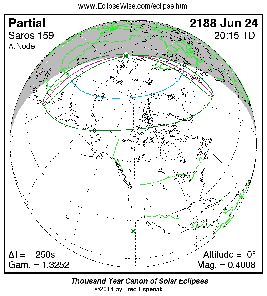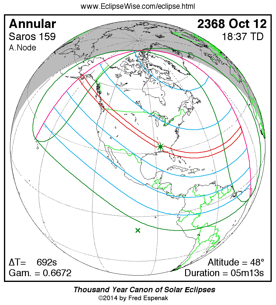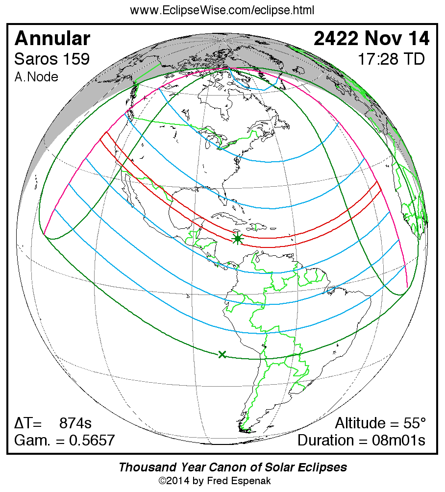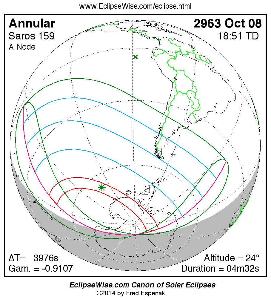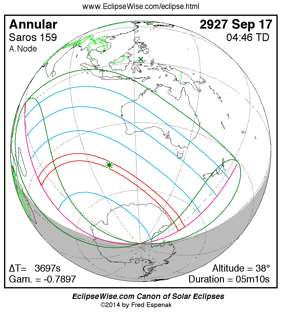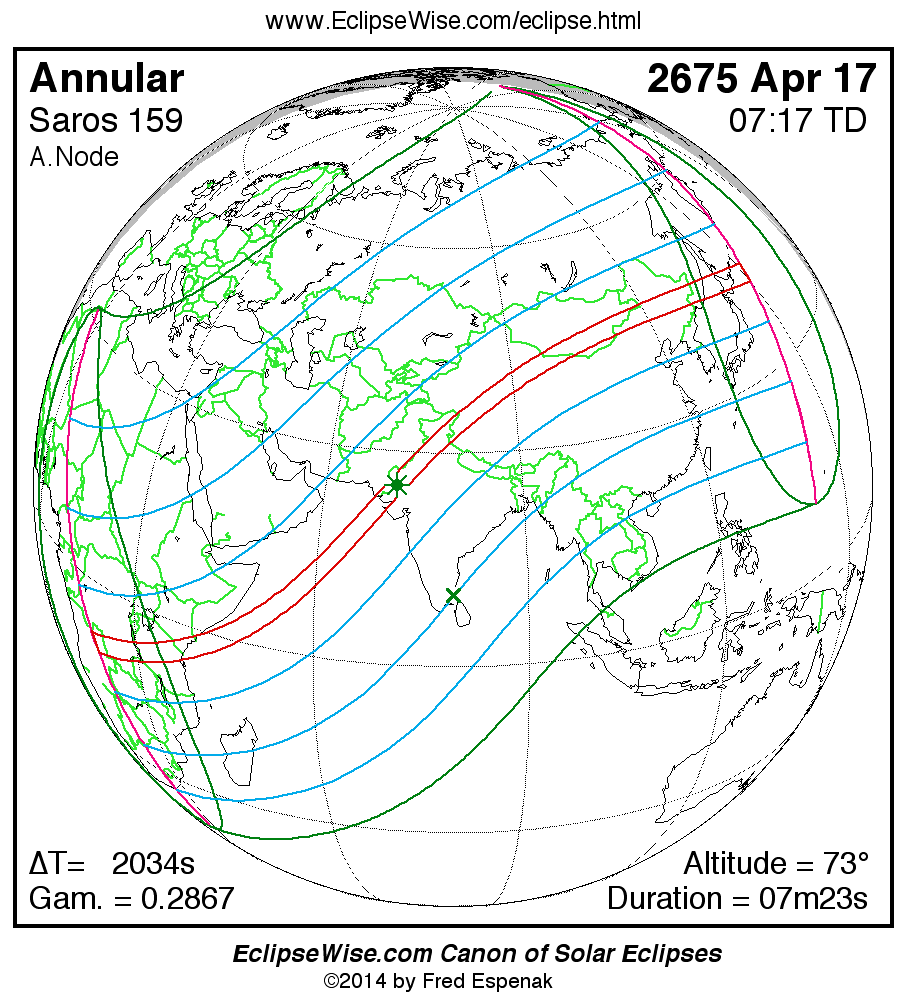 A panorama of all solar eclipses belonging to Saros 159 is presented here. Each map depicts the geographic region of visibility for a single eclipse. For central eclipses, the total or annular path is plotted in either blue (total) or red (annular). The date and time is given for the instant of Greatest Eclipse. Every map serves as a hyperlink to the EclipseWise Prime page for that eclipse where a larger map and complete details for the eclipse can be found. Visit the Key to Solar Eclipse Maps for a detailed explanation of these maps. Near the bottom of the page are a series of hyperlinks for more on solar eclipses.