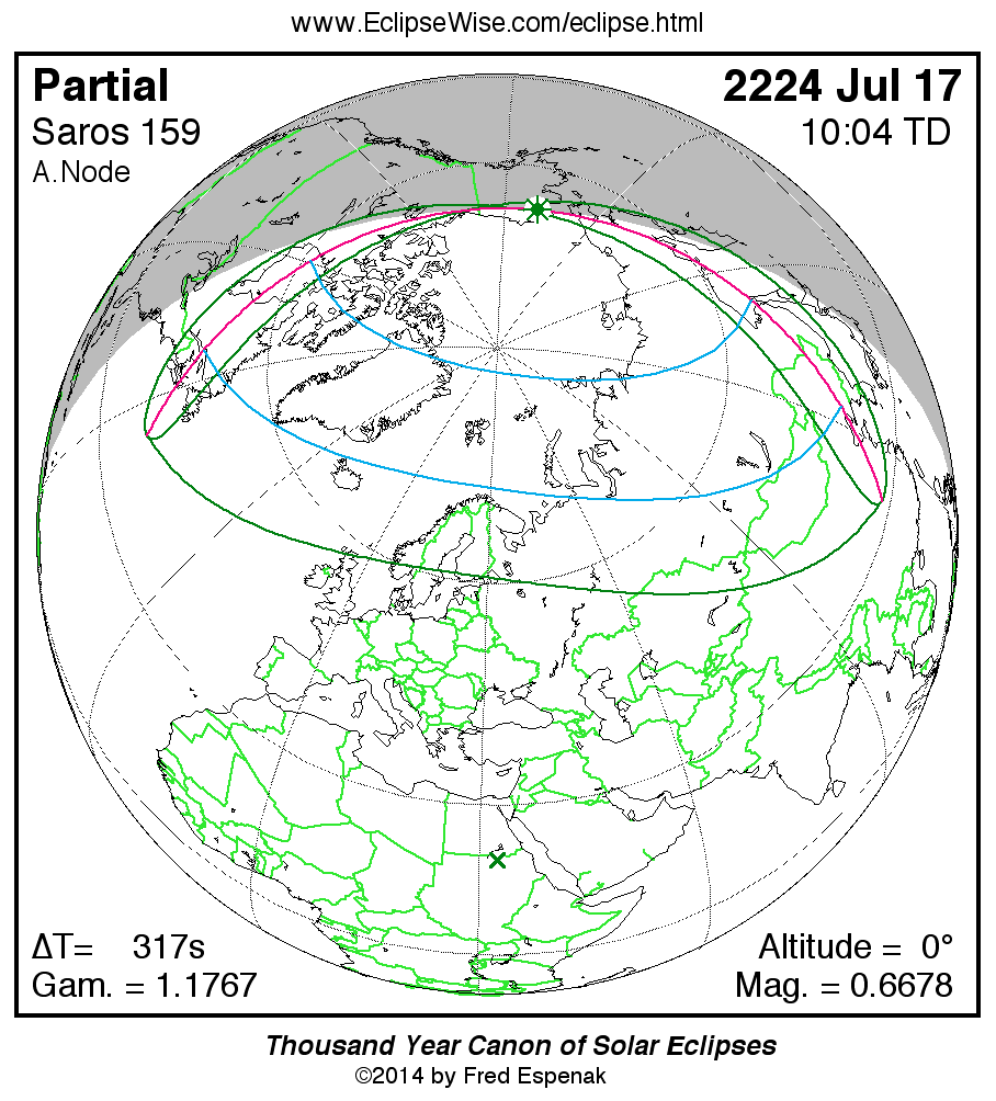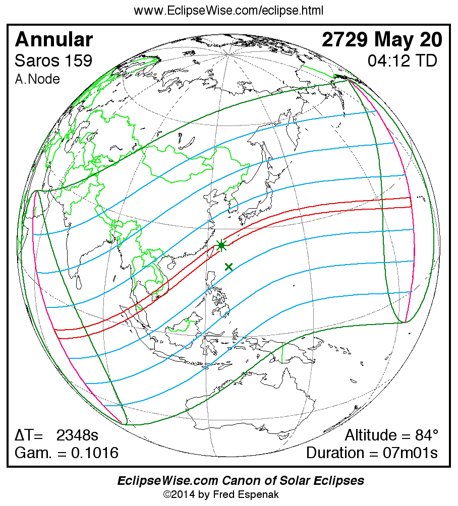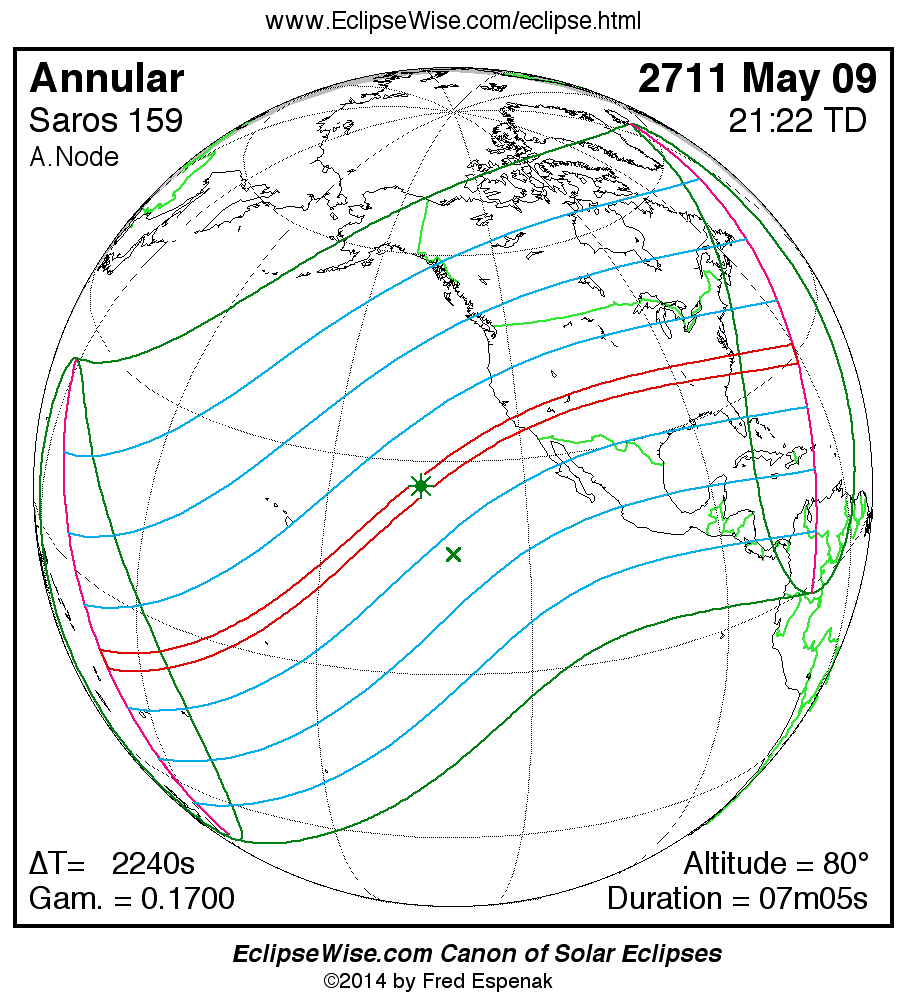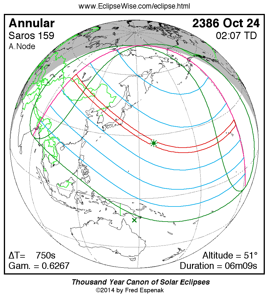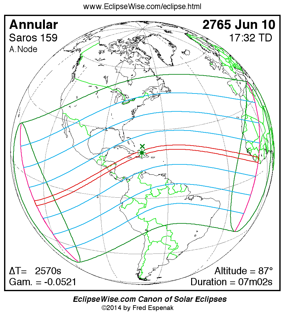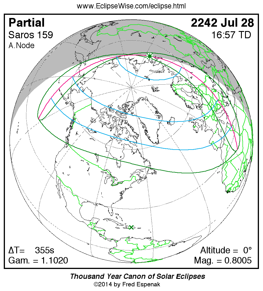 A panorama of all solar eclipses belonging to Saros 159 is presented here. Each map depicts the geographic region of visibility for a single eclipse. For central eclipses, the total or annular path is plotted in either blue (total) or red (annular). The date and time is given for the instant of Greatest Eclipse. Every map serves as a hyperlink to the EclipseWise Prime page for that eclipse where a larger map and complete details for the eclipse can be found. Visit the Key to Solar Eclipse Maps for a detailed explanation of these maps. Near the bottom of the page are a series of hyperlinks for more on solar eclipses.
