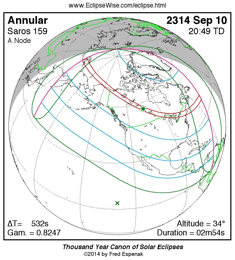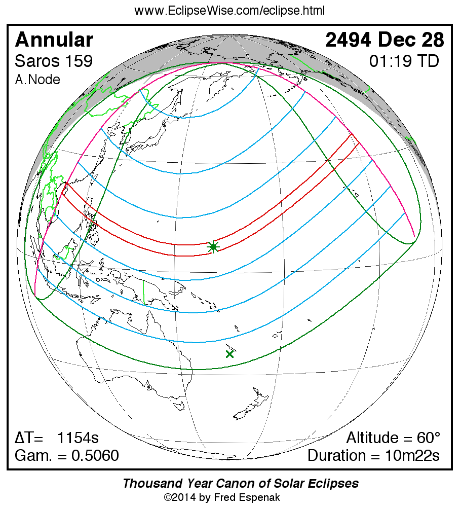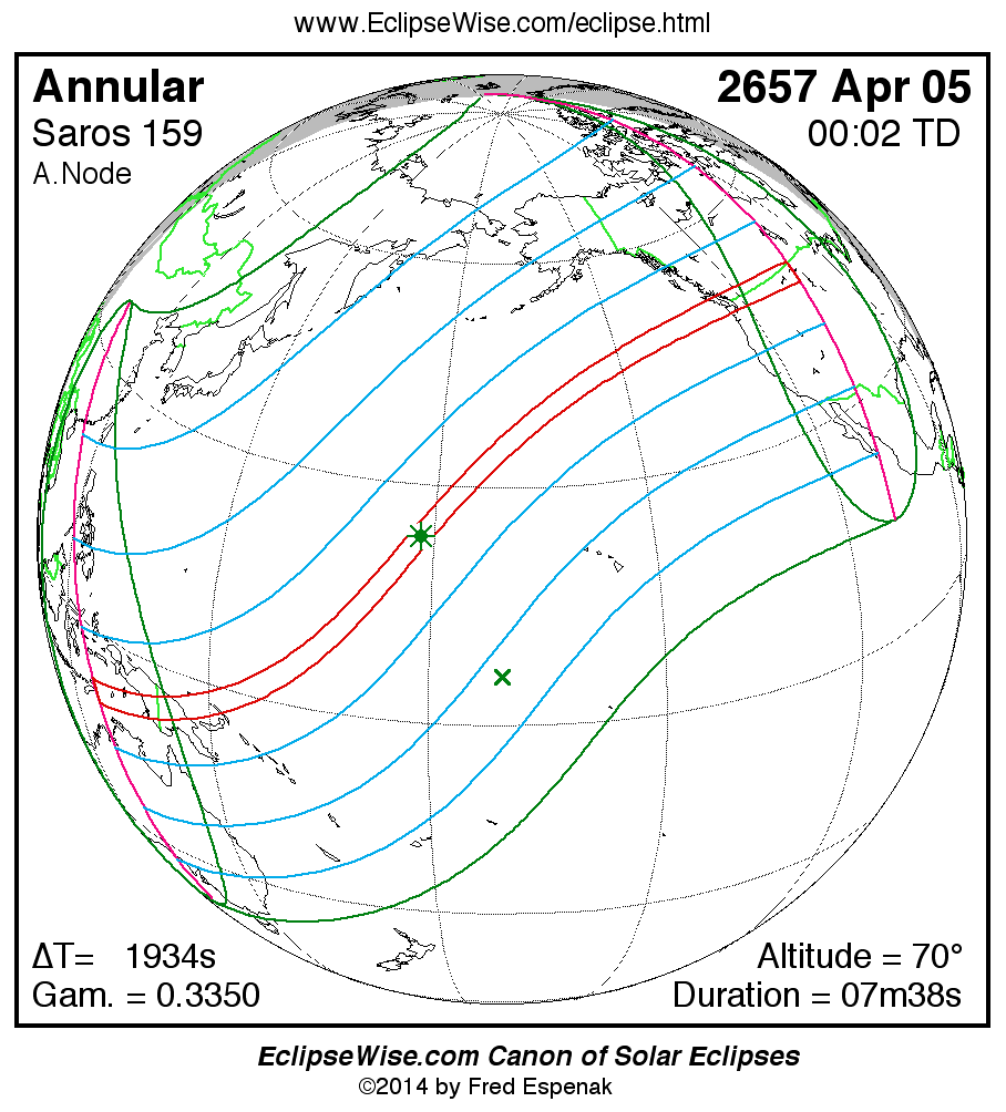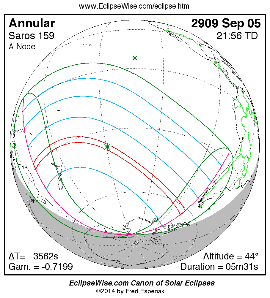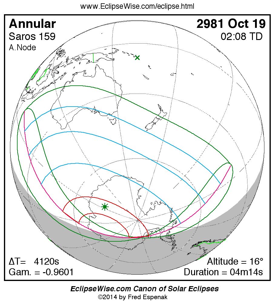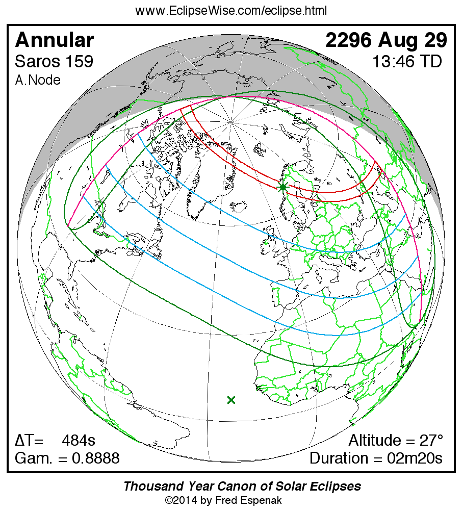 A panorama of all solar eclipses belonging to Saros 159 is presented here. Each map depicts the geographic region of visibility for a single eclipse. For central eclipses, the total or annular path is plotted in either blue (total) or red (annular). The date and time is given for the instant of Greatest Eclipse. Every map serves as a hyperlink to the EclipseWise Prime page for that eclipse where a larger map and complete details for the eclipse can be found. Visit the Key to Solar Eclipse Maps for a detailed explanation of these maps. Near the bottom of the page are a series of hyperlinks for more on solar eclipses.