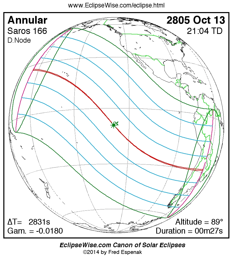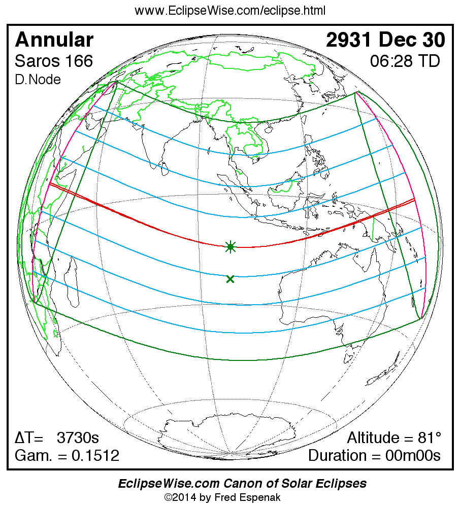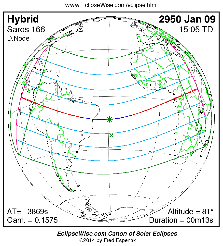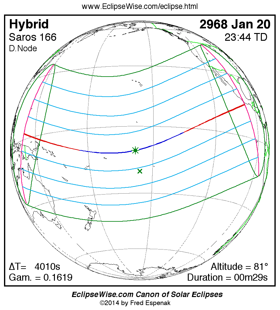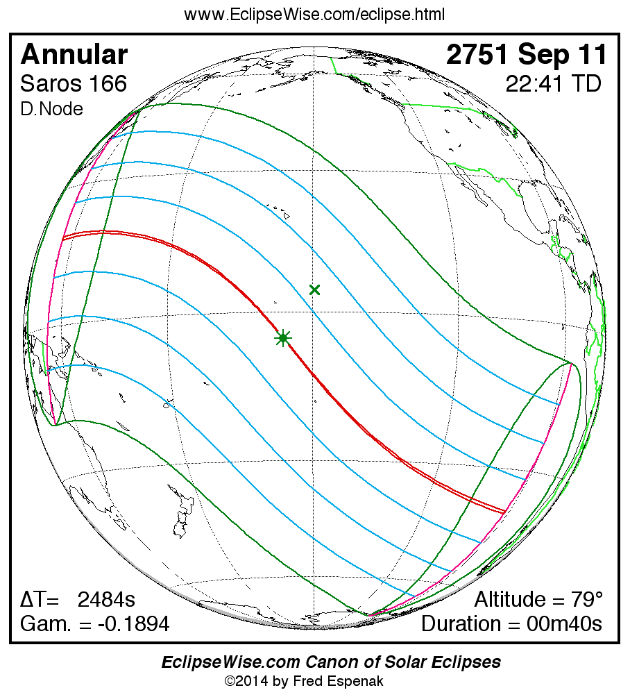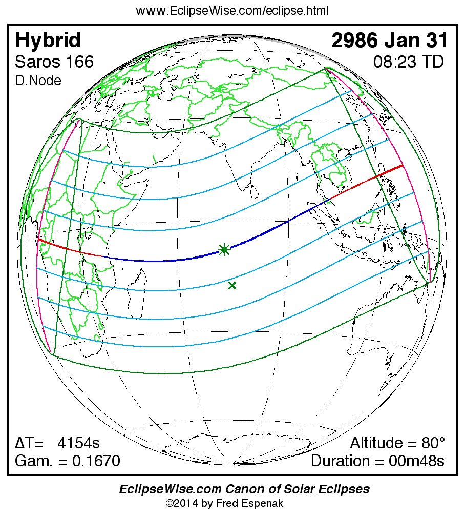 A panorama of all solar eclipses belonging to Saros 166 is presented here. Each map depicts the geographic region of visibility for a single eclipse. For central eclipses, the total or annular path is plotted in either blue (total) or red (annular). The date and time is given for the instant of Greatest Eclipse. Every map serves as a hyperlink to the EclipseWise Prime page for that eclipse where a larger map and complete details for the eclipse can be found. Visit the Key to Solar Eclipse Maps for a detailed explanation of these maps. Near the bottom of the page are a series of hyperlinks for more on solar eclipses.