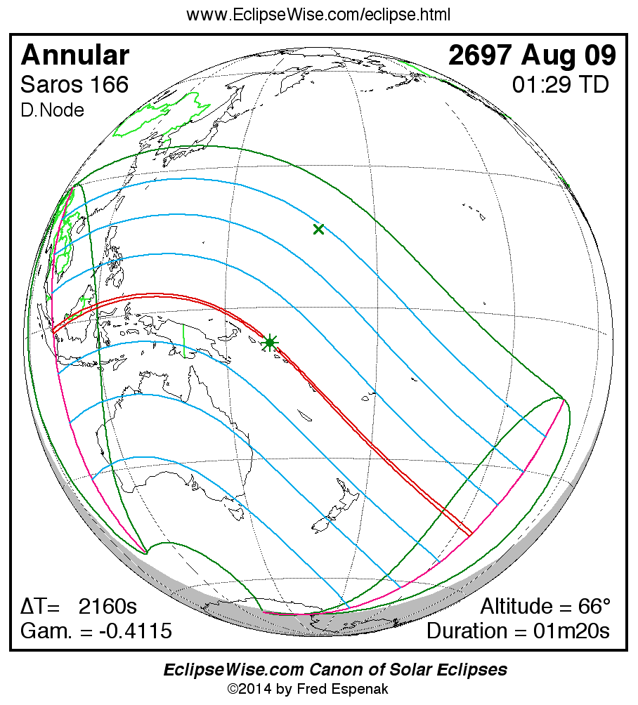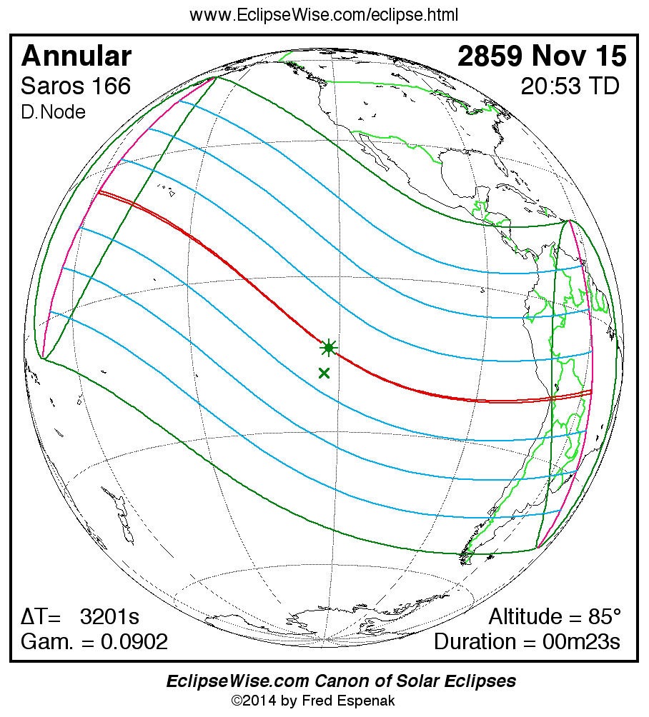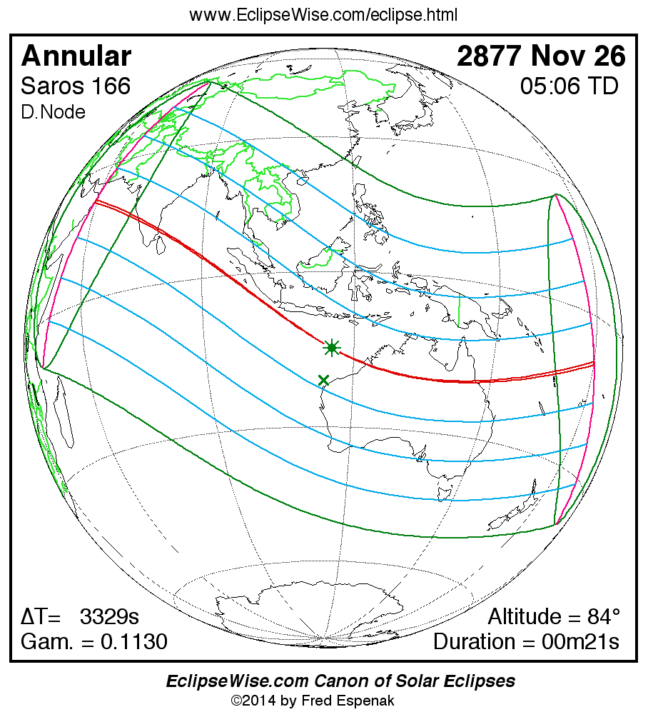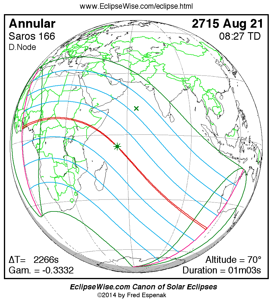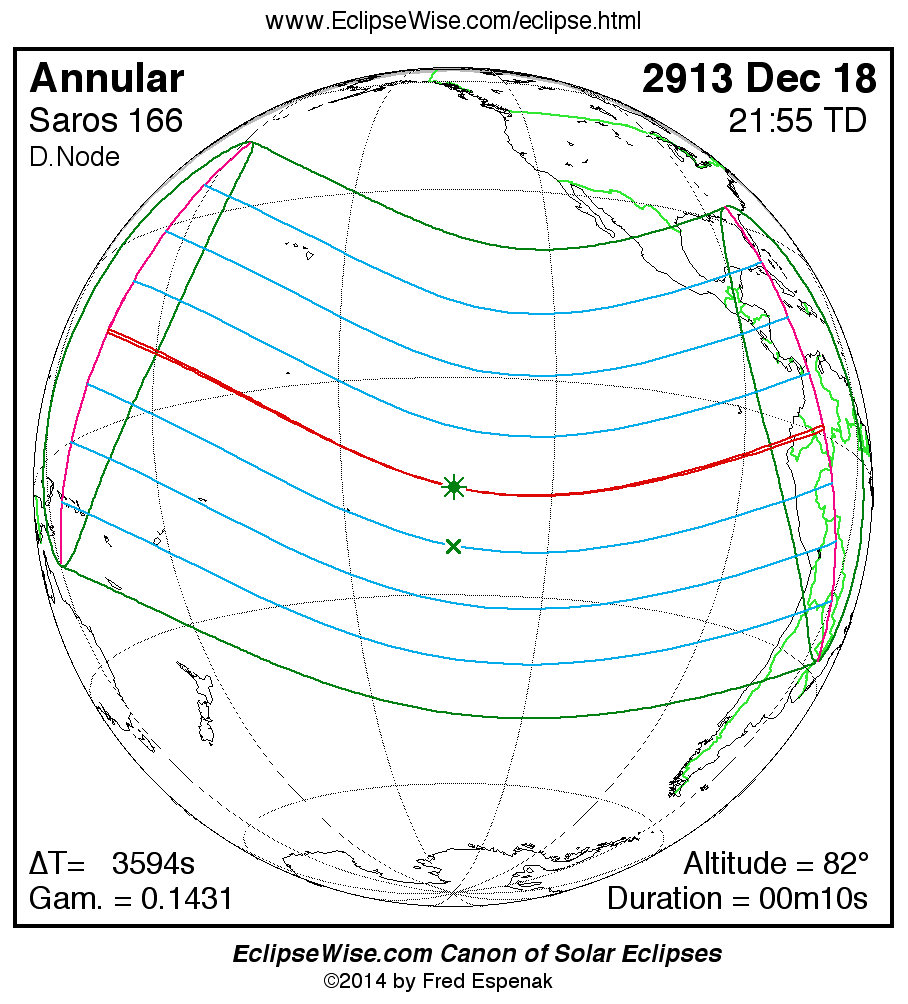 A panorama of all solar eclipses belonging to Saros 166 is presented here. Each map depicts the geographic region of visibility for a single eclipse. For central eclipses, the total or annular path is plotted in either blue (total) or red (annular). The date and time is given for the instant of Greatest Eclipse. Every map serves as a hyperlink to the EclipseWise Prime page for that eclipse where a larger map and complete details for the eclipse can be found. Visit the Key to Solar Eclipse Maps for a detailed explanation of these maps. Near the bottom of the page are a series of hyperlinks for more on solar eclipses.