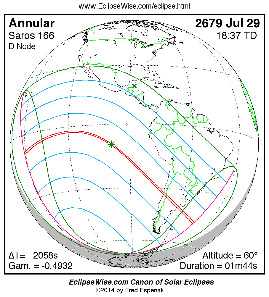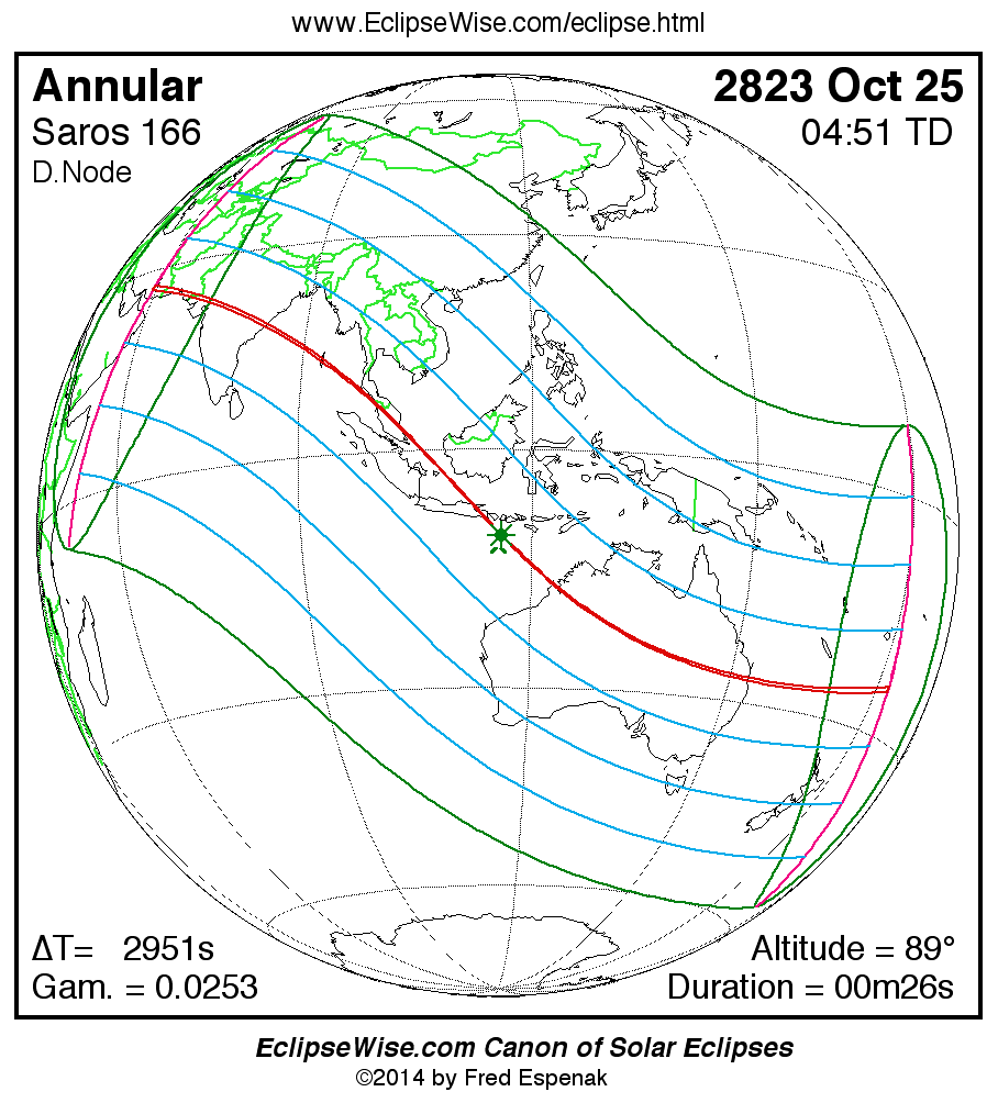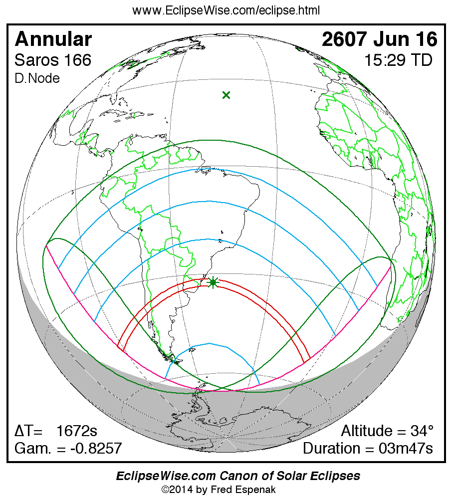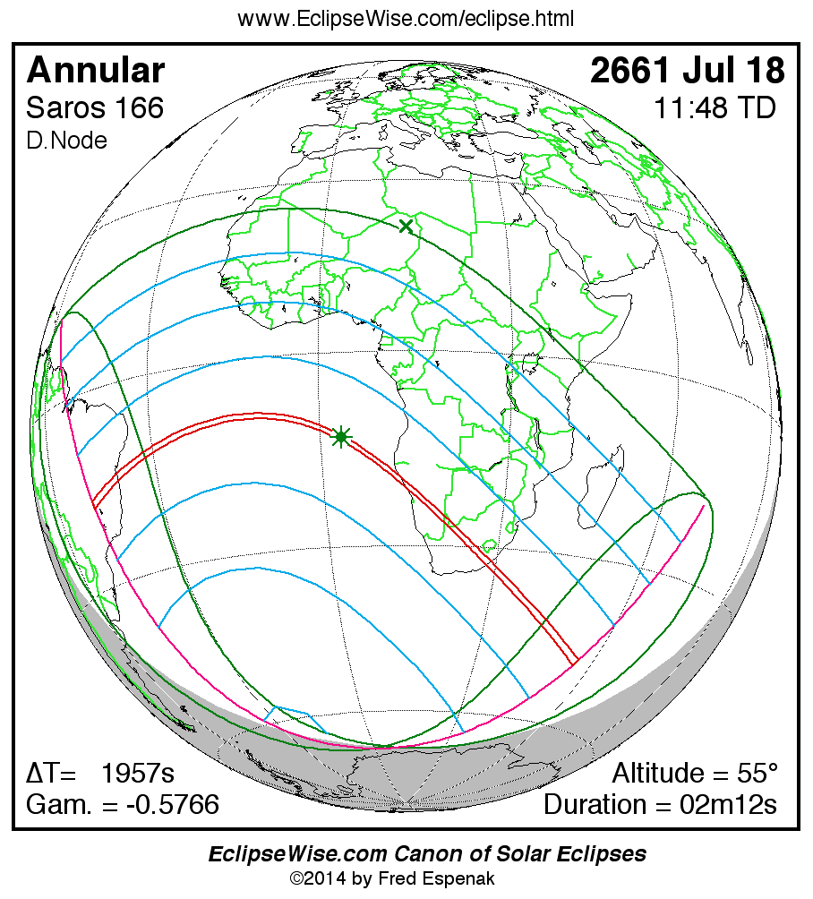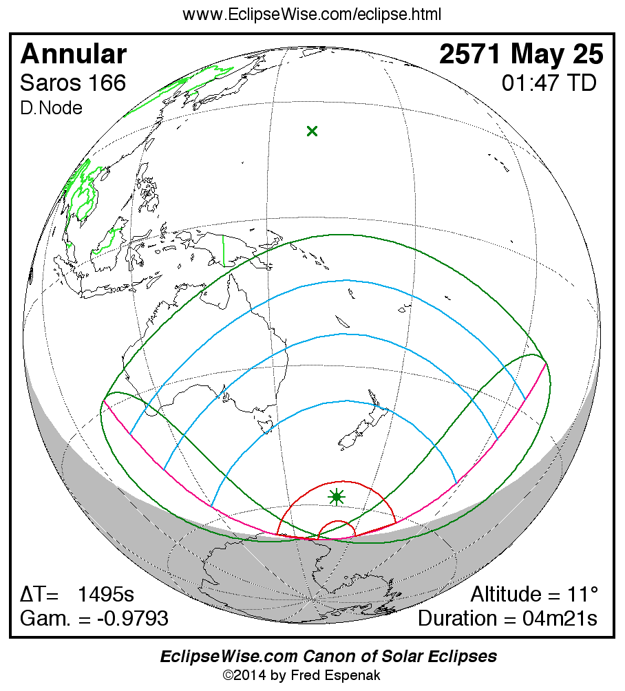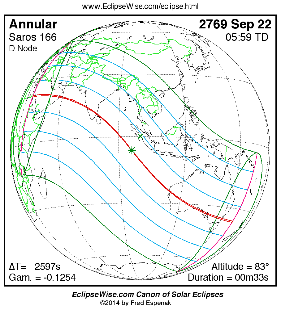 A panorama of all solar eclipses belonging to Saros 166 is presented here. Each map depicts the geographic region of visibility for a single eclipse. For central eclipses, the total or annular path is plotted in either blue (total) or red (annular). The date and time is given for the instant of Greatest Eclipse. Every map serves as a hyperlink to the EclipseWise Prime page for that eclipse where a larger map and complete details for the eclipse can be found. Visit the Key to Solar Eclipse Maps for a detailed explanation of these maps. Near the bottom of the page are a series of hyperlinks for more on solar eclipses.